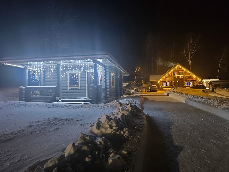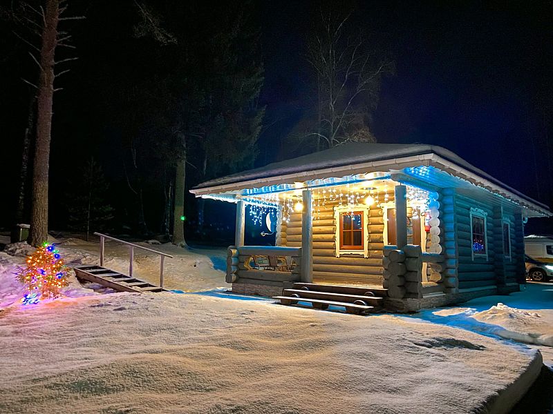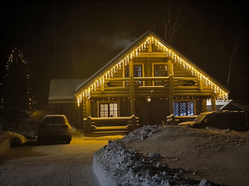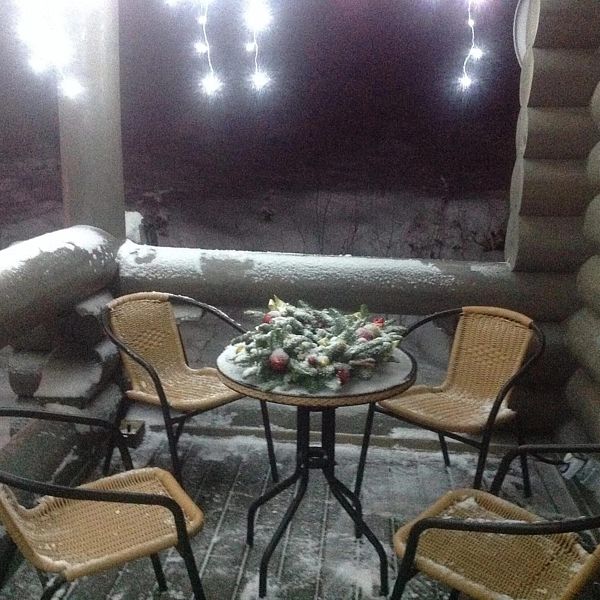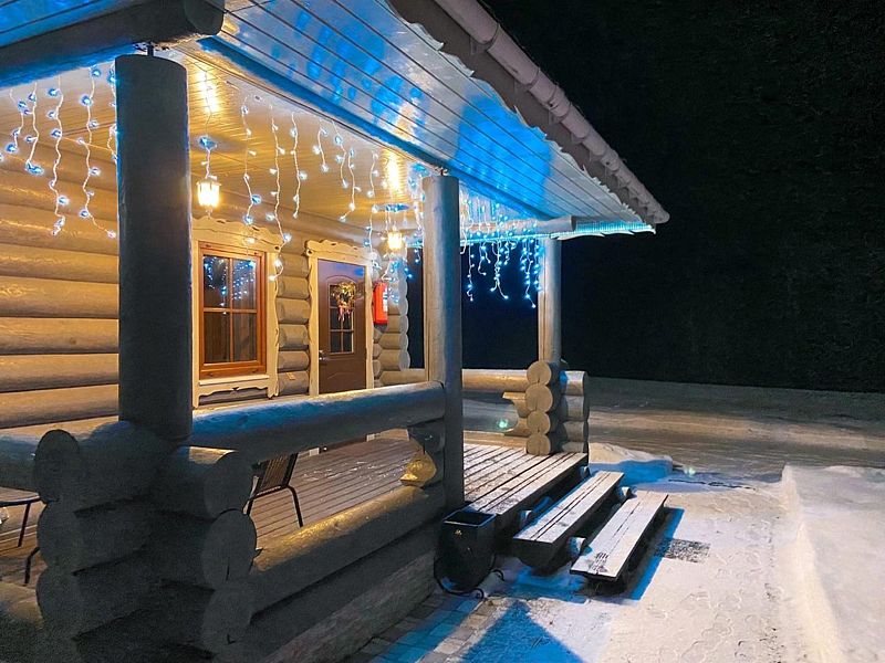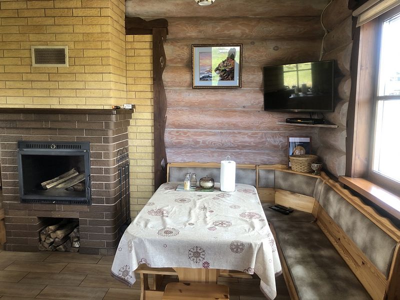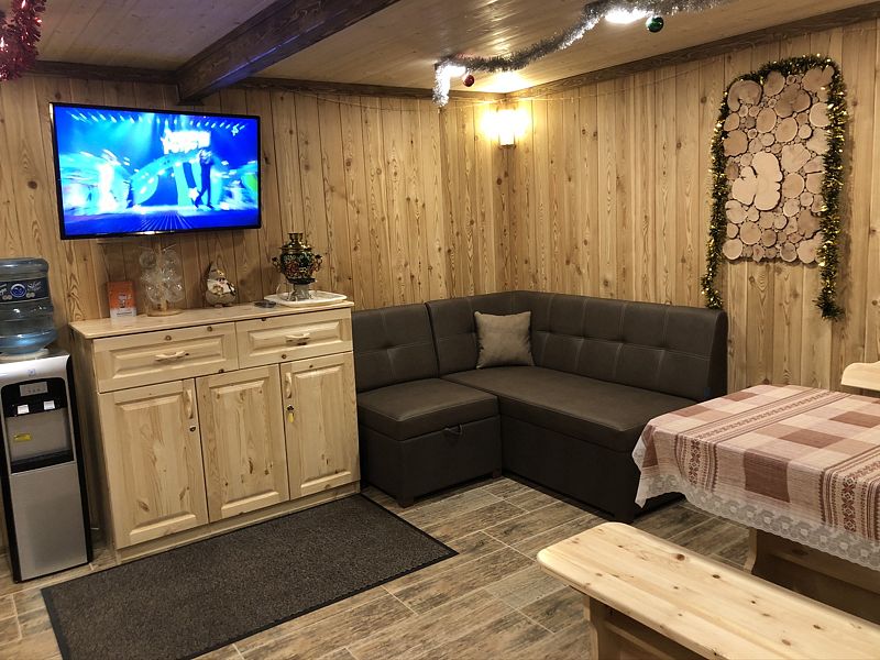 Домик уютный и комфортный. Все новое. Очень красивая подсветка крыши дома, по всему периметру. Часть площади занимает веранда под крышей. Внутри гостиная-кухня с телевизором (HD) со спальным местом на 2-х человек, камин и спальная комната с двумя кроватями на 4-х человек. Везде теплые полы.