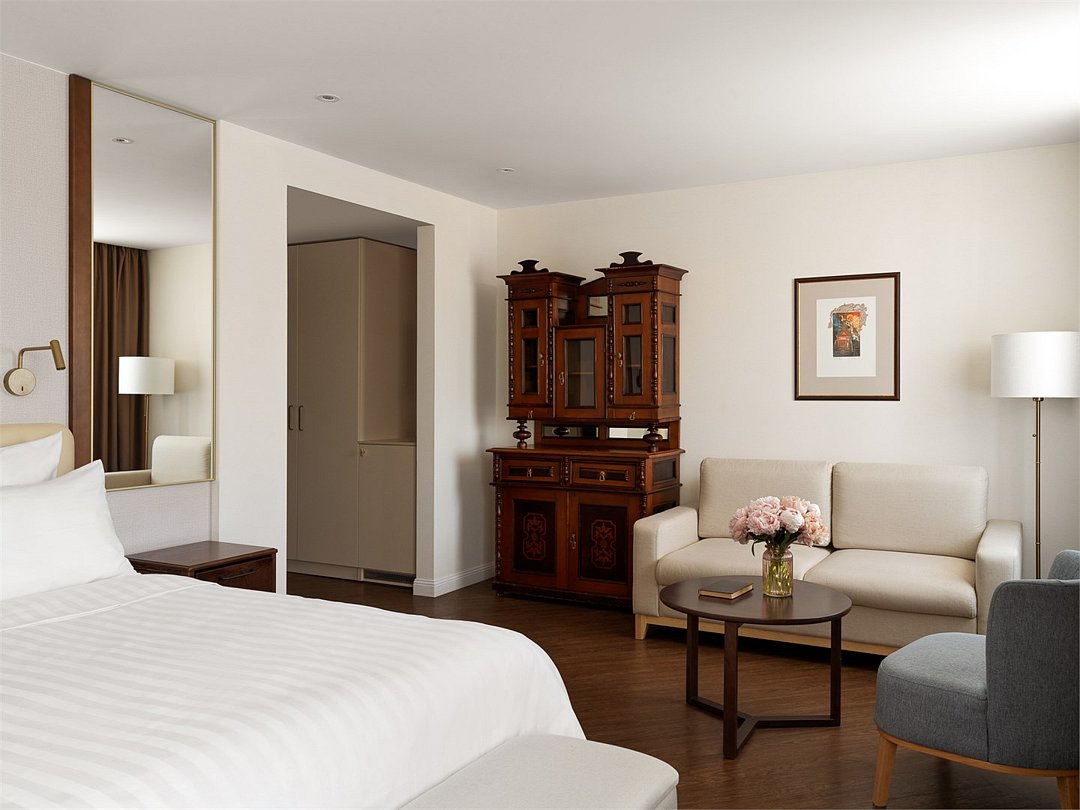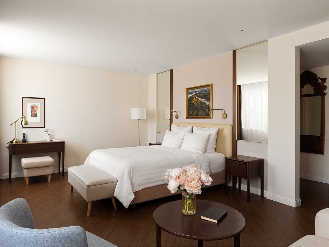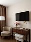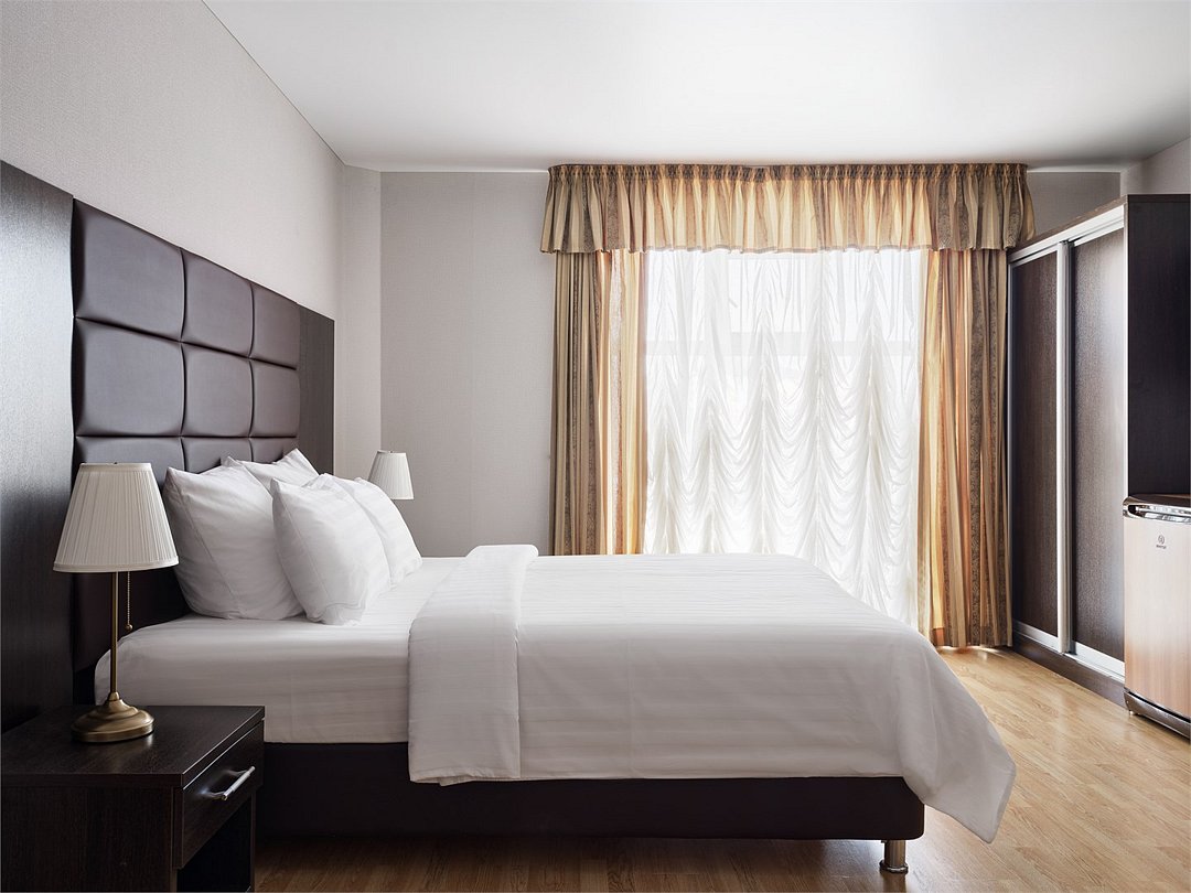 кабельное телевидение, Wi-Fi, интернет, телефон, кондиционер, фен, обогреватель, душевая кабина, банные полотенца, гигиенические средства, двуспальная кровать, стулья, шкаф для одежды, вешалки, журнальный столик, обеденный стол, зеркало, комод, эксклюзивная мебель, чайный набор, сейф, чайник, унитаз, раковина, питьевая вода, вид на город, стаканы, туалетные средства, телевизор с плоским экраном, мини-холодильникВ гостиничном номере