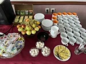 Для отдыхающих ежедневно подается завтрак в кафе. В меню представлены различные нарезки, горячие блюда, салаты, фрукты, мюсли, йогурты. На чайном столе представлены разные виды чая и кофе, конфеты.