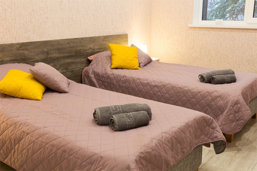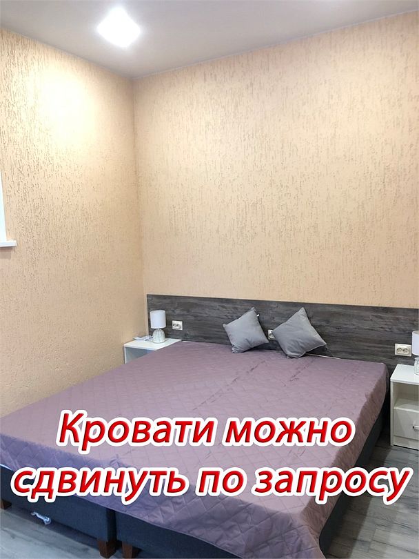Кровать в спальной в сдвинутом состоянии как двуспальная. Можно раздвинуть кровати по запросу. Двуспальный диван в гостиной 1000х2000.