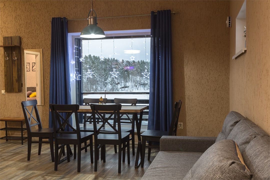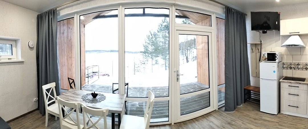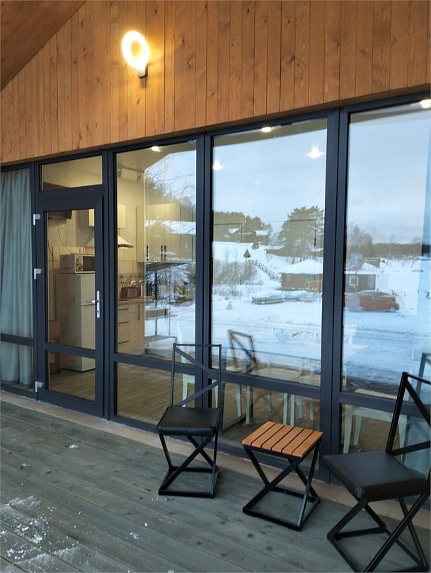 «Черная жемчужина 45м2 Барн» дом до 4 гостей (2 гостя в спальной и два гостя в гостиной) с панорамными окнами на залив. Находится в Сортавала, поселок Токкарлахти. Стабильный Wi-fi.