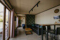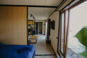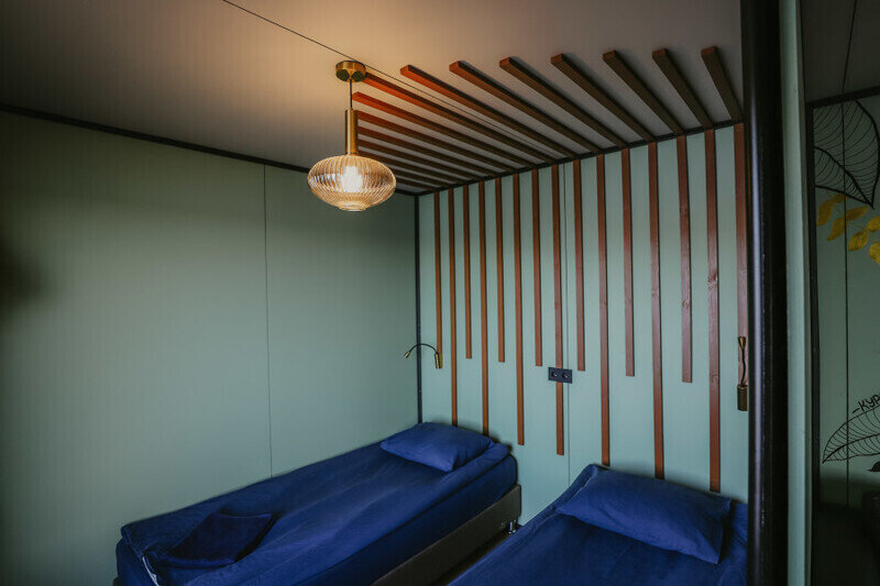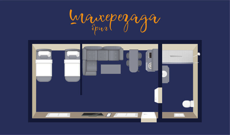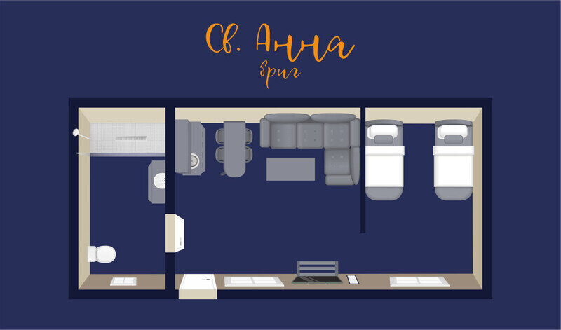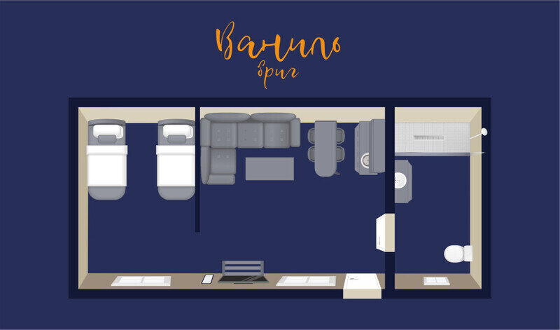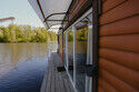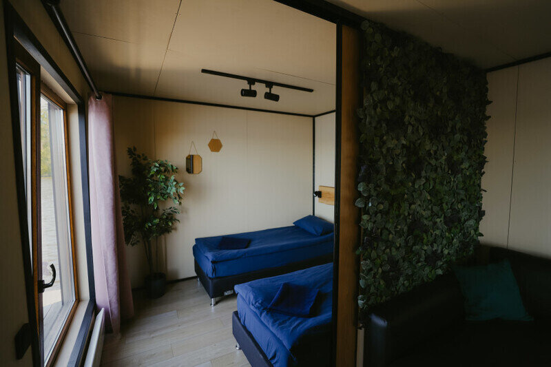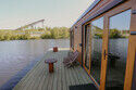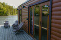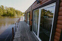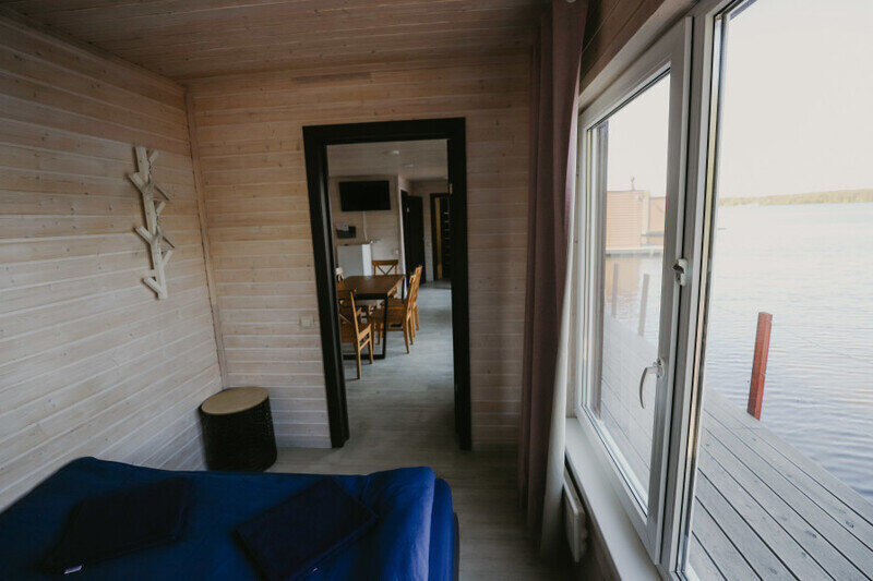 Уютный домик на воде, вмещающий в себя до 6 человек, 2 спальни, а также гостиная с большими окнами и открытой террасой. В первой спальне установлена двухспальная кровать, во второй - две односпальные кровати (способные трансформироваться в двуспальную), в гостиной двухместный диван-кровать. В домике имеется: телевизор, микроволновка и холодильник. Ванная комната с душевой кабинкой и туалетом.