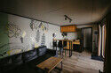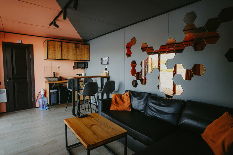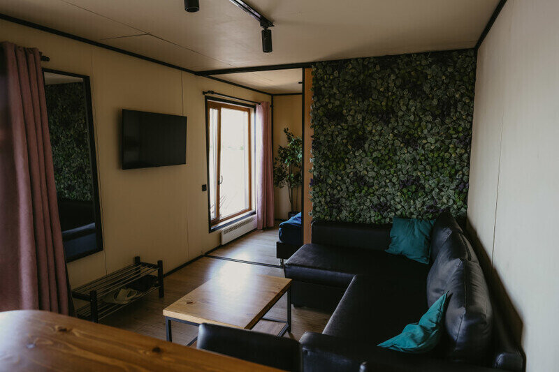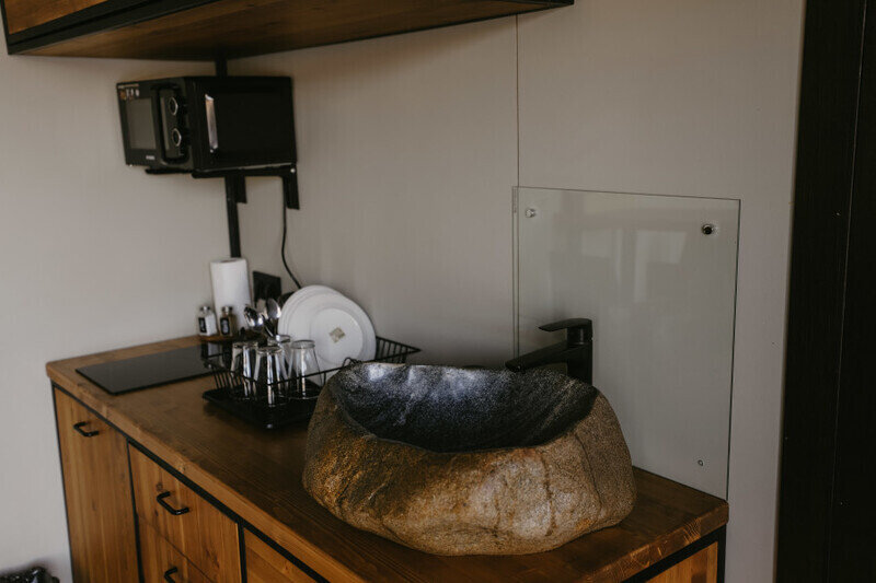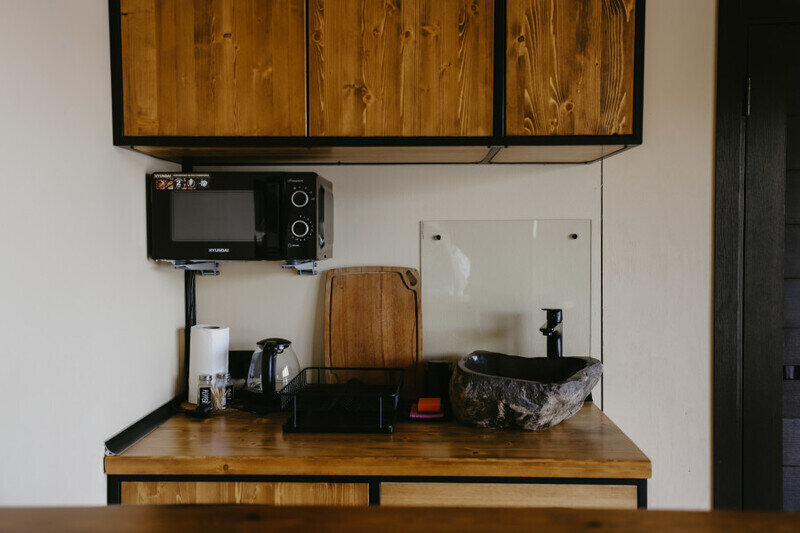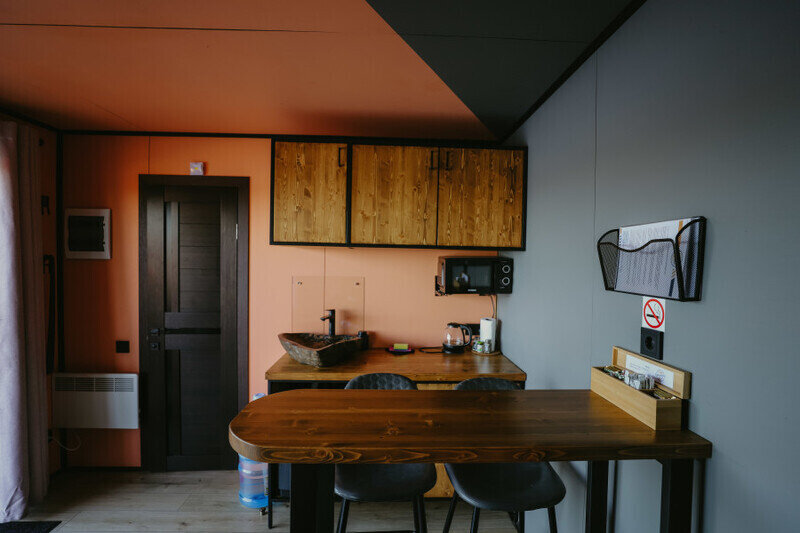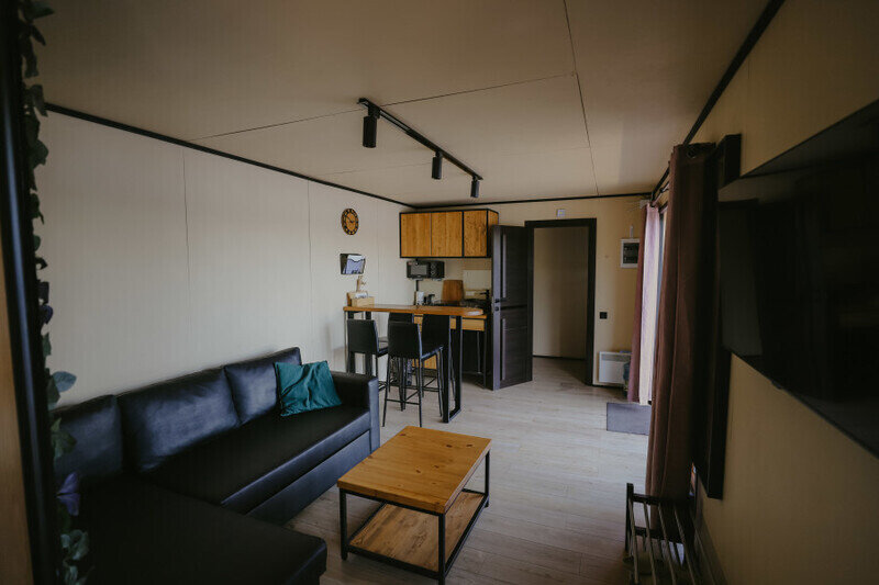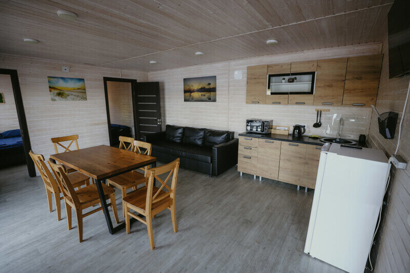 Касательно домиков, в них есть все необходимое для проживания, посуда, постельное белье, мыло, для посуды средство, полотенца, чай сахар соль перец и тд. В домике подогрев пола, есть встроенная плита, холодильник, микроволновка, фен, вай Фай, телевизор со Смарт тв.