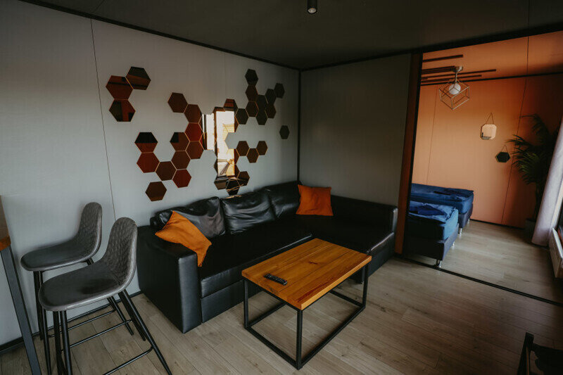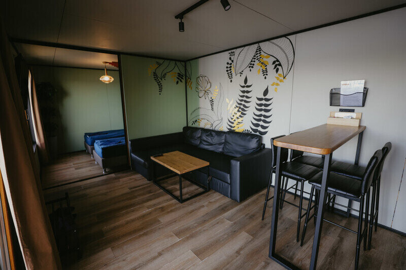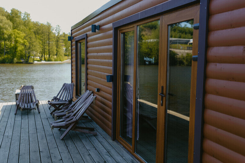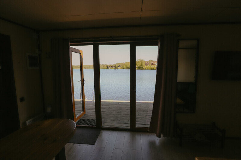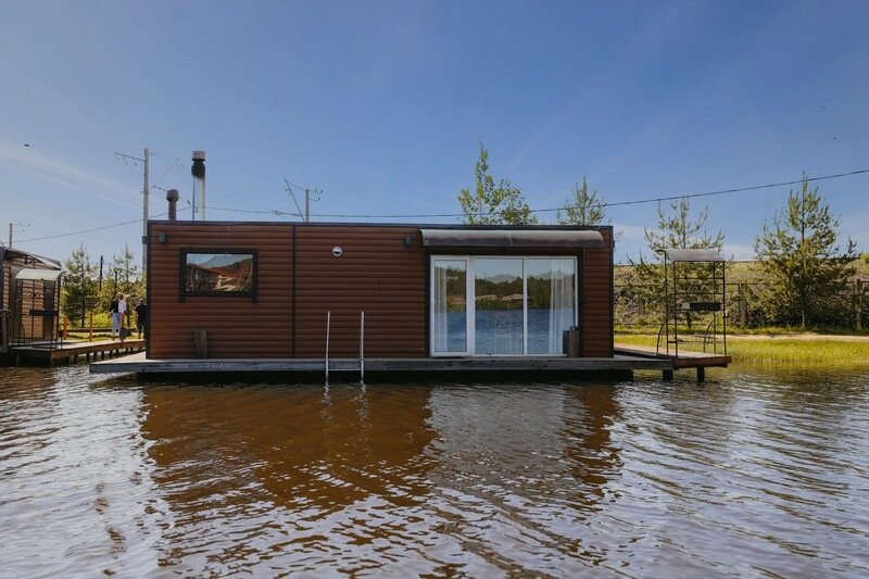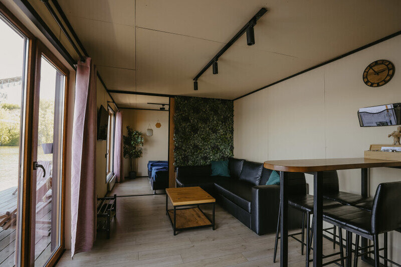 Уютный домик на воде, вмещающий в себя до 2 человек. В домике расположен угловой диван, который раскладывается в полноценное двухспальное место.