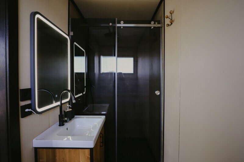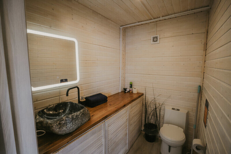 В домике имеется: телевизор, микроволновка, холодильник. Ванная комната с двумя душевыми кабинками и туалетом.