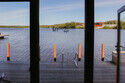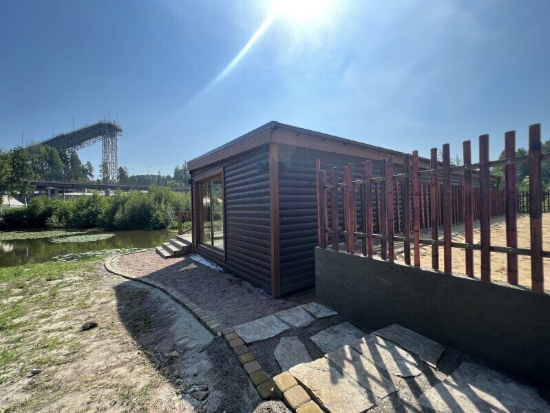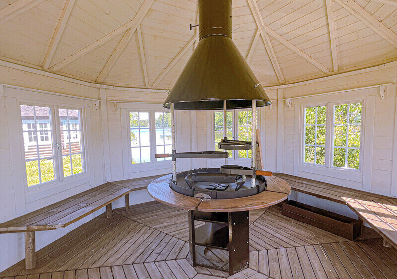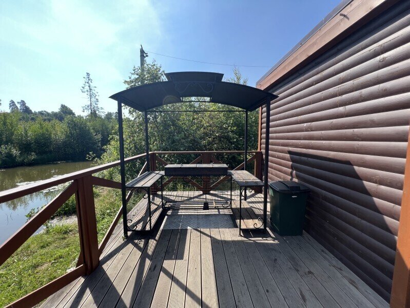Современный гриль-домик с прекрасным видом на озеро. На улице мангал.