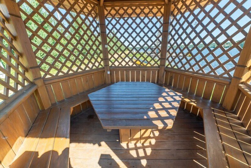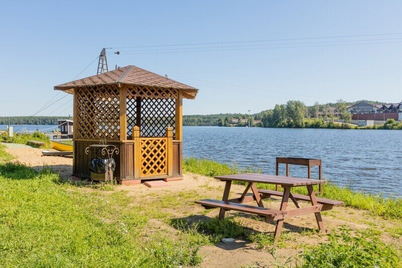 Уютная видовая беседка закрытого типа, расположенная на берегу озера.