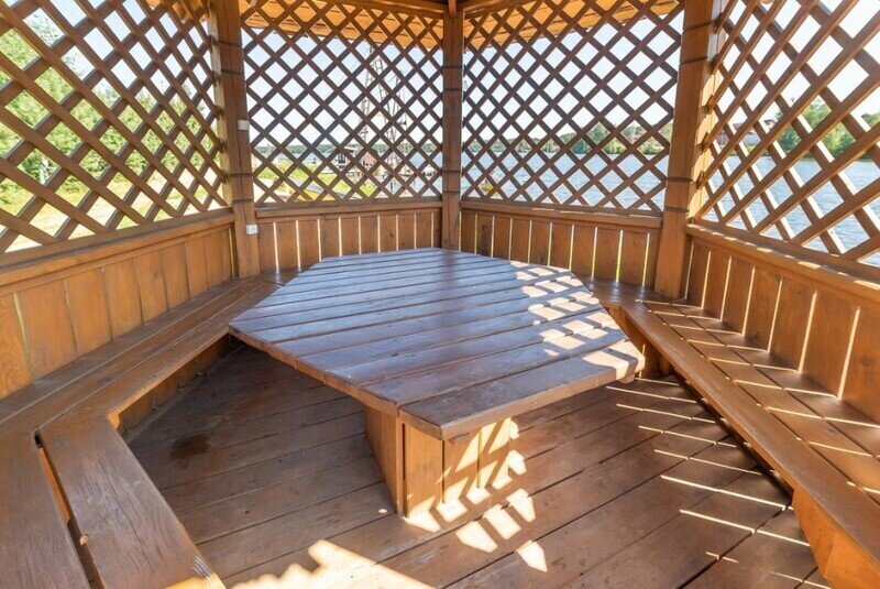 Уютная видовая беседка открытого типа, расположенная на берегу озера.