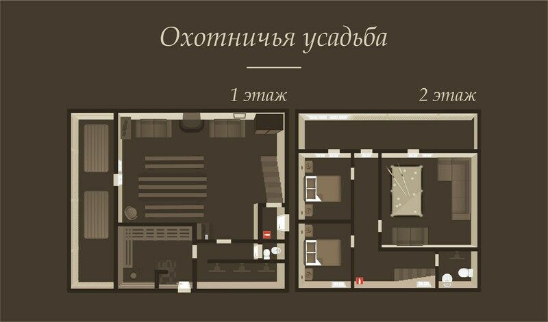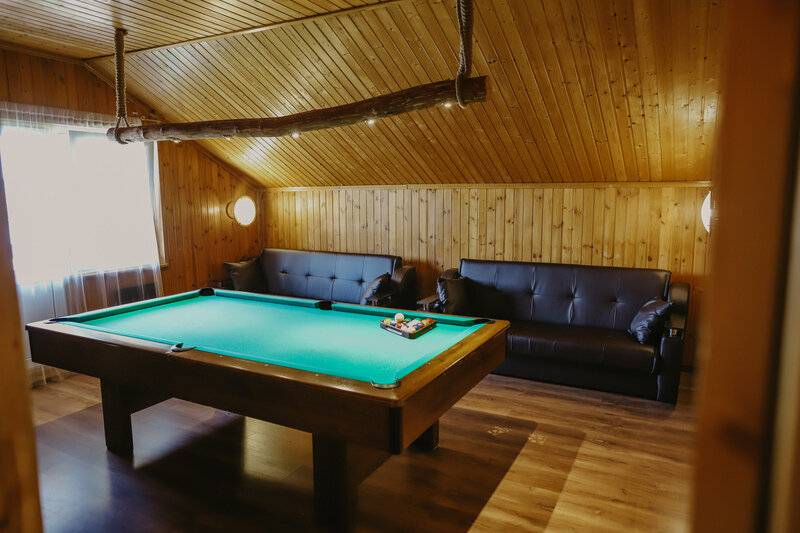 На 1-м этаже находится: гостиная, диван-кровать, баня на дровах, санузел (душ, туалет). На 2-м этаже: 2 спальни, с двуспальными кроватями, комната с 2-мя односпальными кроватями, и американский пулом (бильярд), лоджия с 2-мя двуспальными кроватями.
