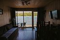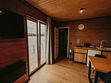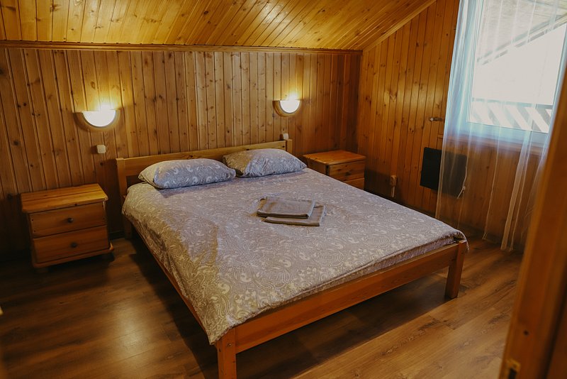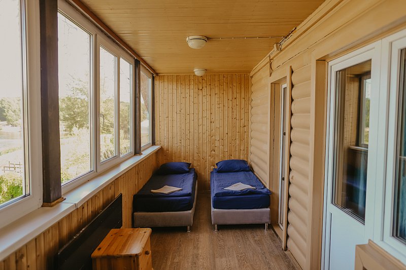 Коттедж с большими окнами, двумя спальными комнатами с двуспальными кроватями, гостиная с раздвижным диваном, двумя раскладными креслами, спутниковым ТВ, и всем необходимым для отдыха. Также в коттедже есть русская баня и на улице мангал. Т.к. владельцы борются за чистоту озера, в коттедже установлен биотуалет.