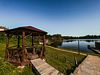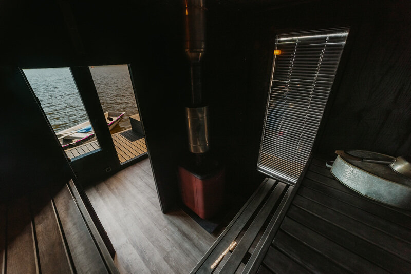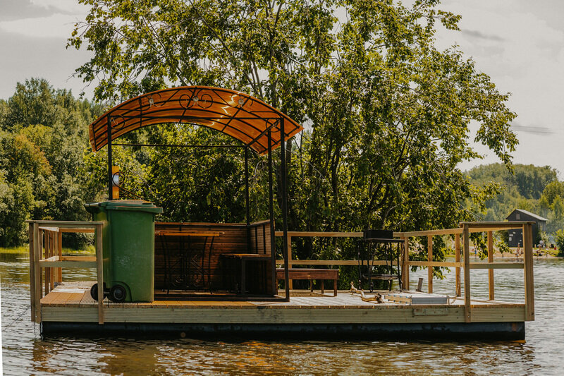 Плавучая банька расположена между плавучим домом Карп и Сазан. В баньке комфортно смогут находиться до 6 человек. Панорамный вид.