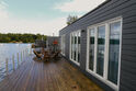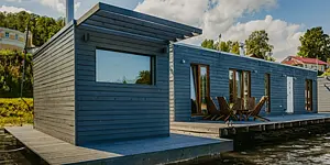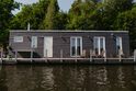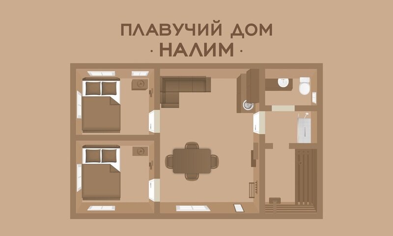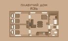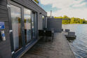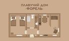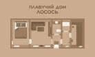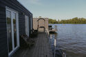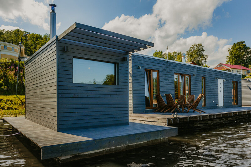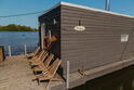 Уютный плавучий дом на 6 человек с баней, 2 спальнями, большими окнами и открытой террасой.