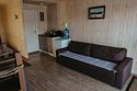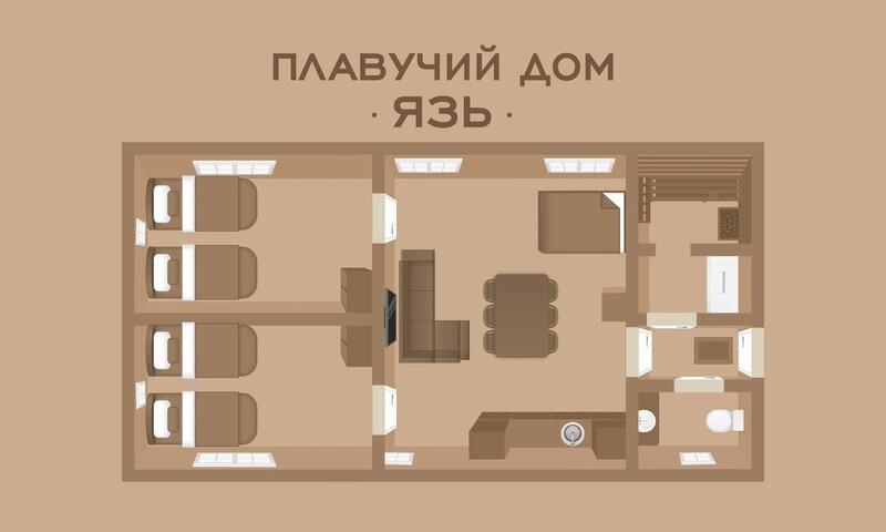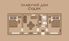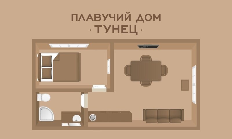 Уютный плавучий коттедж на 4 человек, 1 спальня (огорожена выдвижной перегородкой), с большими окнами и открытой террасой.