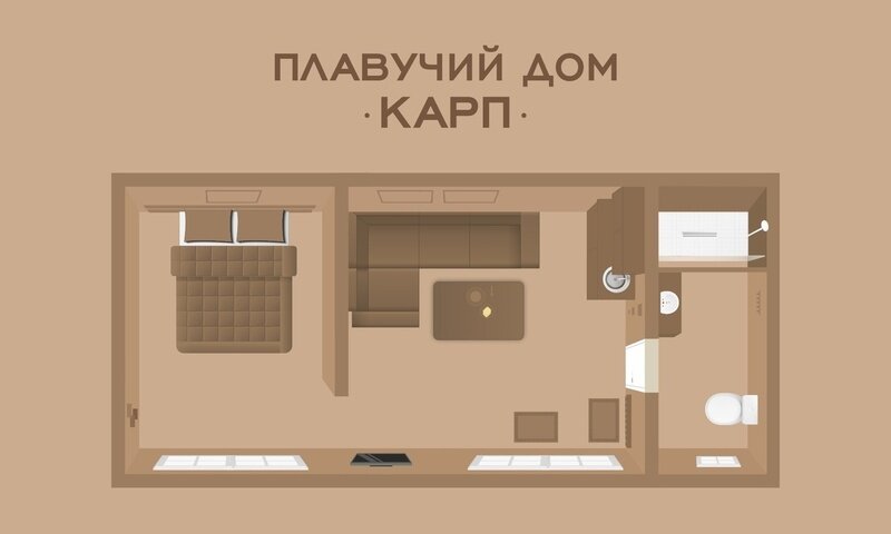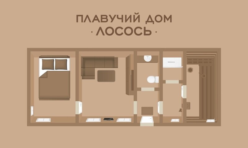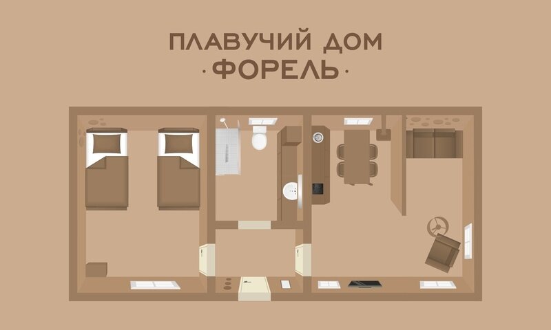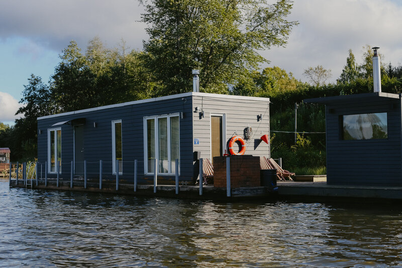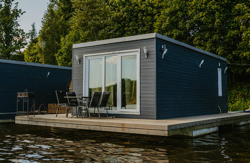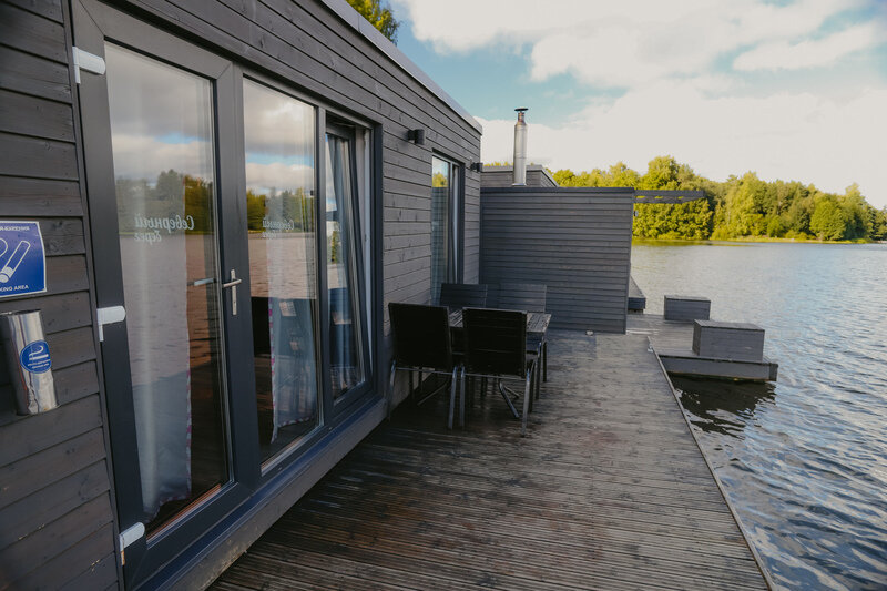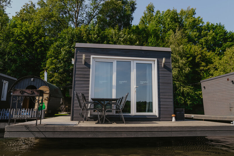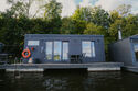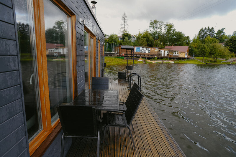Уютный домик на воде, вмещающий в себя 4 человека, 1 спальня (огорожена выдвижной перегородкой), с большими окнами и открытой террасой.