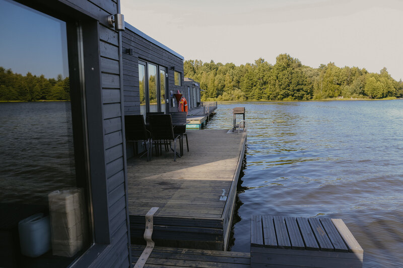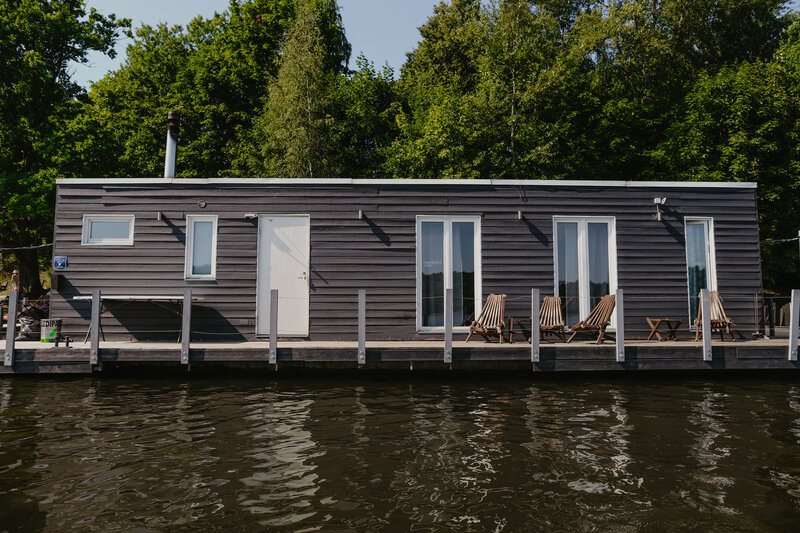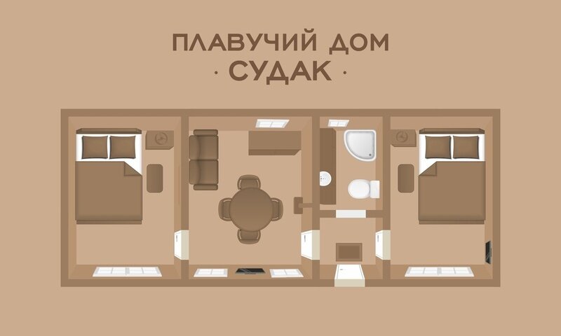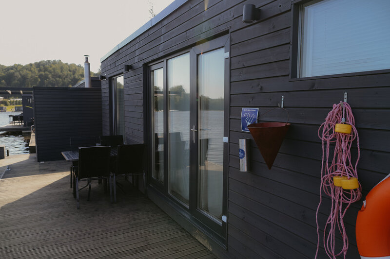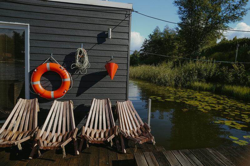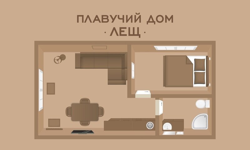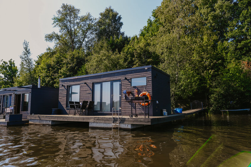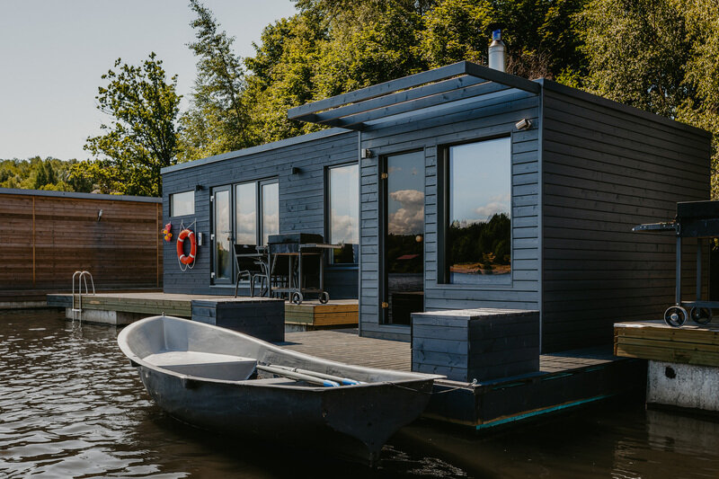 Уютный домик на воде, вмещающий в себя 4 человека, 1 спальня (огорожена выдвижной перегородкой), с большими окнами и открытой террасой.