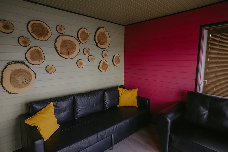 Коттедж с одной спальной комнатой (в спальной комнате две односпальные кровати, которые трансформируются в двуспальную), гостиной с диван-кроватью, раскладным креслом, электрическим чайником, спутниковым ТВ и всем необходимым для комфортного отдыха. Имеется мангал. Рядом с коттеджем расположена плавучая банька "Сардина" вмещающая в себя 5-х человек. Т.к. владельцы борются за чистоту озера, в коттедже установлен биотуалет.