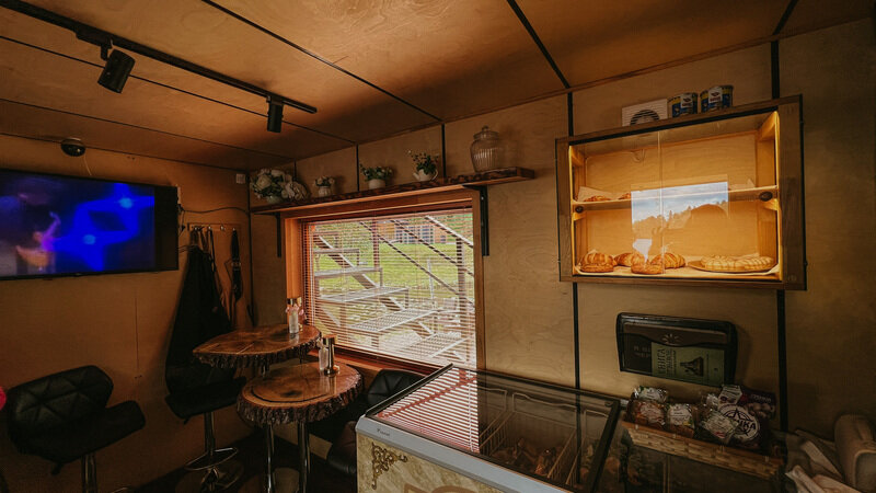 В спальне установлено две односпальные кровати (способные трансформироваться в двуспальную), в гостиной угловой диван-кровать. В коттедже имеется: смарт телевизор, цифровое ТВ, интернет (Wi-Fi), холодильник, столовые приборы. Ванная комната с душевой кабиной, раковиной, унитазом.