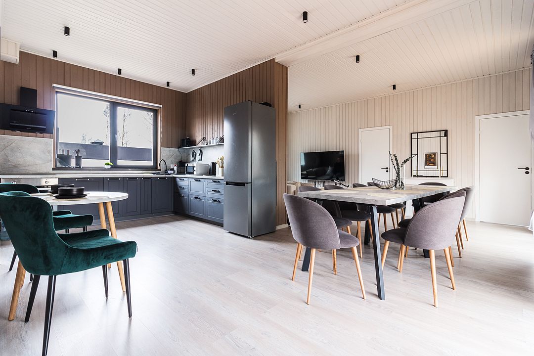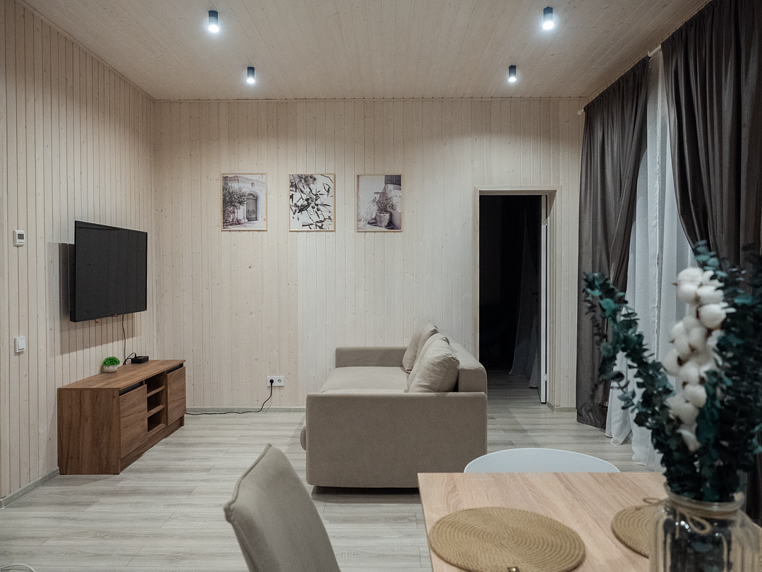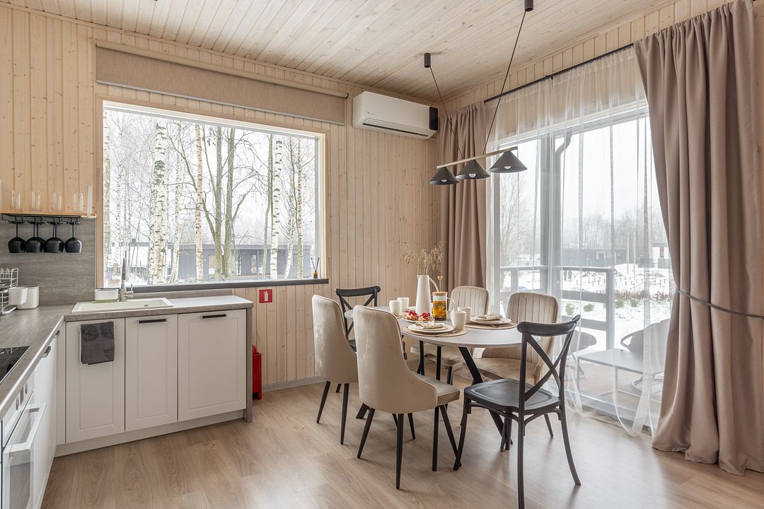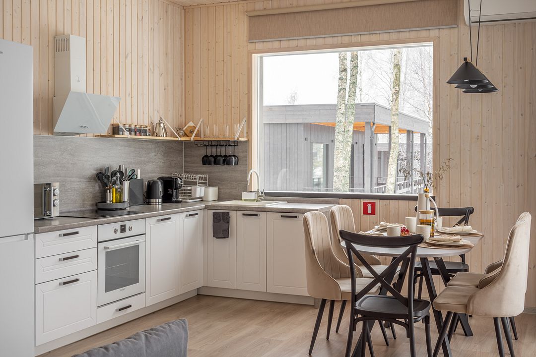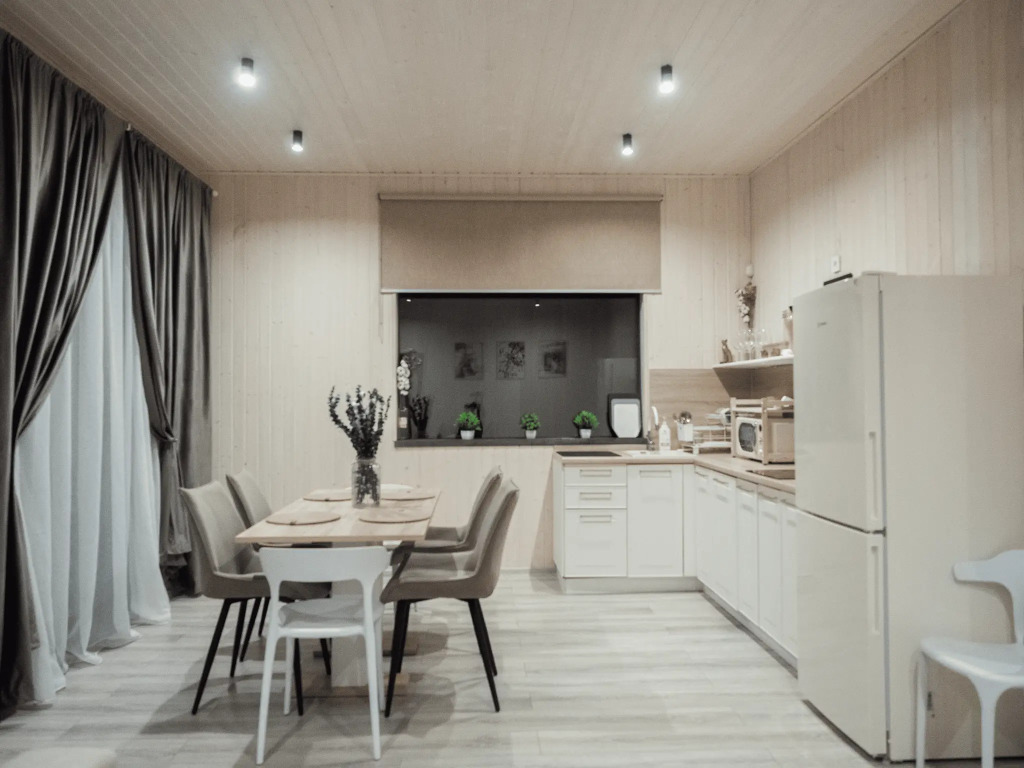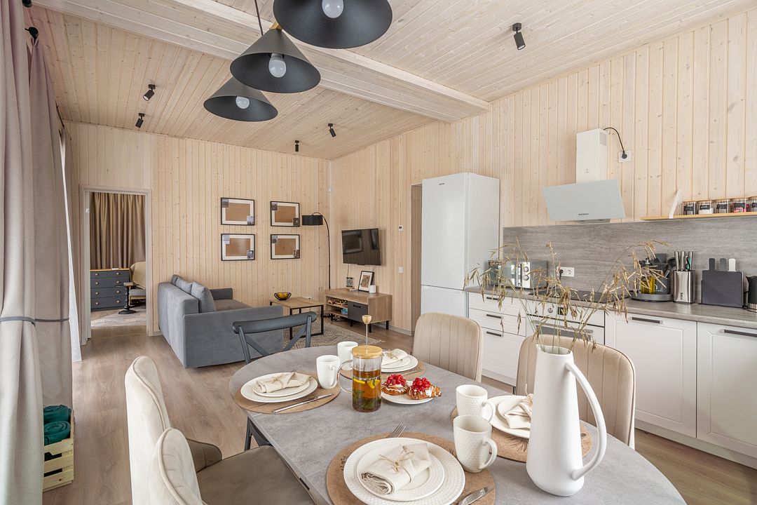 Внутри домика создана атмосфера уюта и комфорта. Просторная кухня-гостиная вмещает большую семью из четырех и более человек. Кухня оборудована всем необходимым для приготовления пищи: плитой, духовкой, холодильником и набором посуды. Две отдельные спальни обеспечивают полноценный отдых всем членам семьи. Дополнительные удобства включают кондиционер, теплые полы, стиральную машину, капсульную кофемашину, посудомоечную машину и детскую мебель, что делает пребывание максимально комфортным для всех возрастов.
