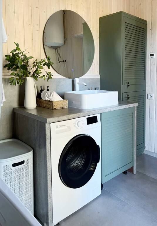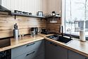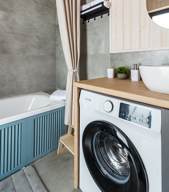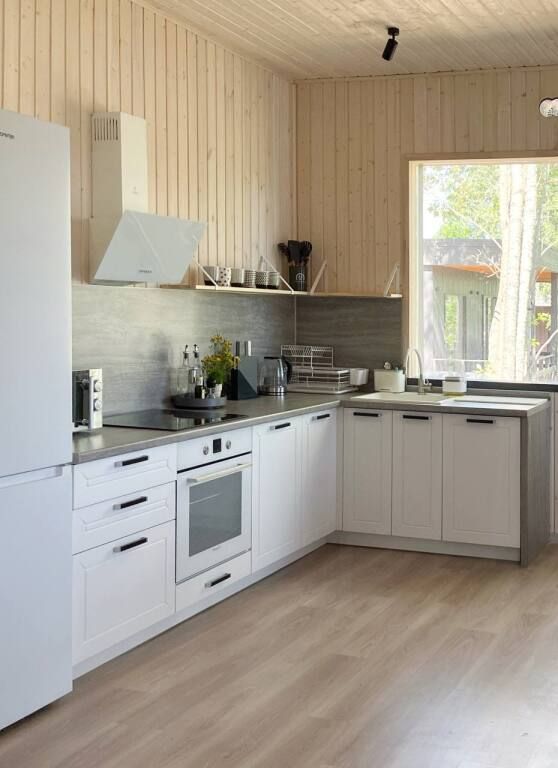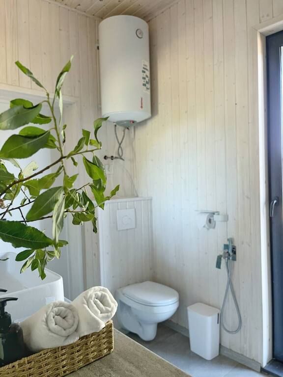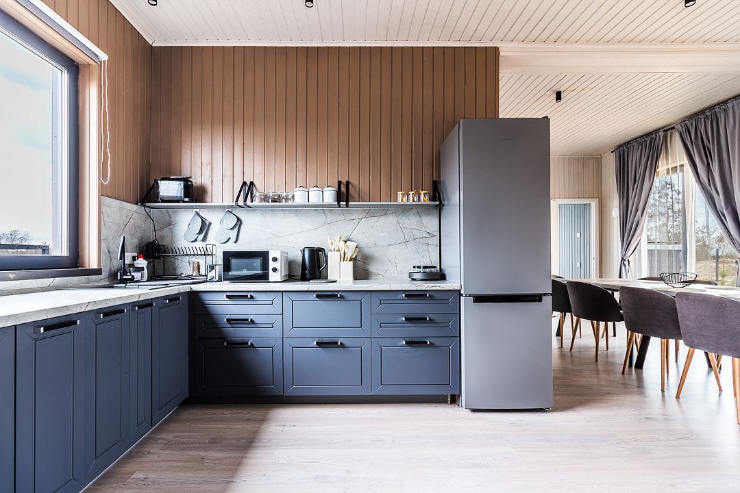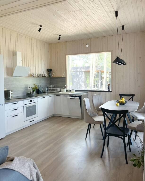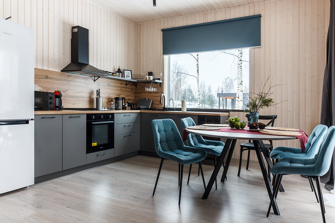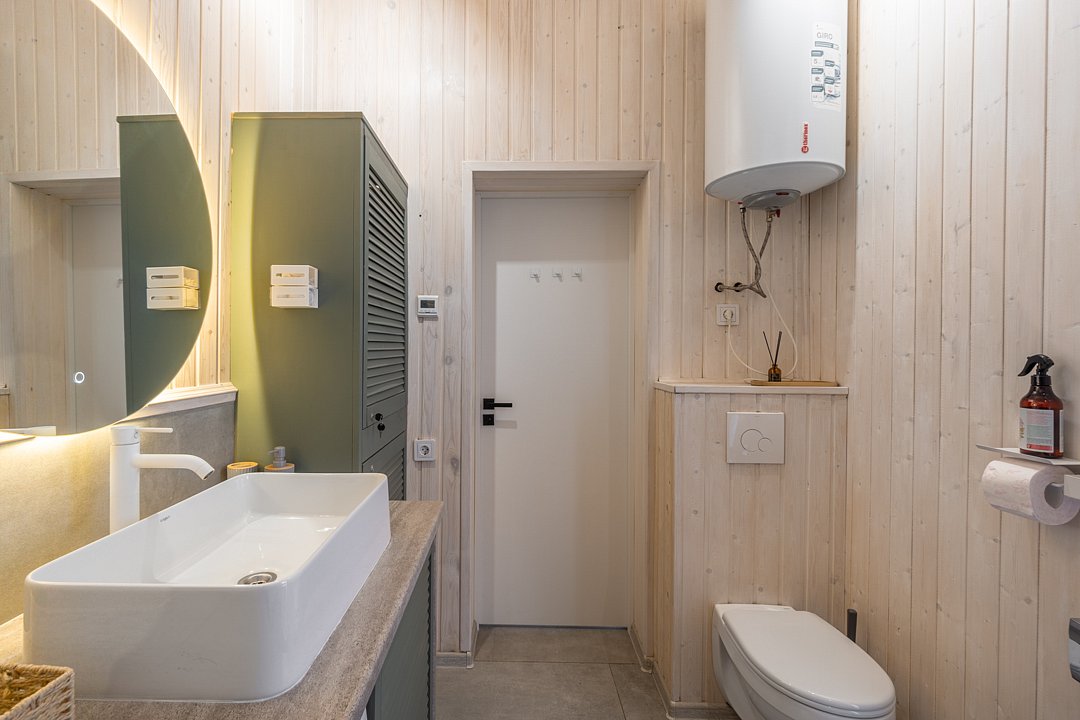 Внутри домика создана атмосфера уюта и комфорта. Просторная кухня-гостиная вмещает большую семью из четырех и более человек. Кухня оборудована всем необходимым для приготовления пищи: плитой, духовкой, холодильником и набором посуды. Две отдельные спальни обеспечивают полноценный отдых всем членам семьи. Дополнительные удобства включают кондиционер, теплые полы, стиральную машину, капсульную кофемашину, посудомоечную машину и детскую мебель, что делает пребывание максимально комфортным для всех возрастов.