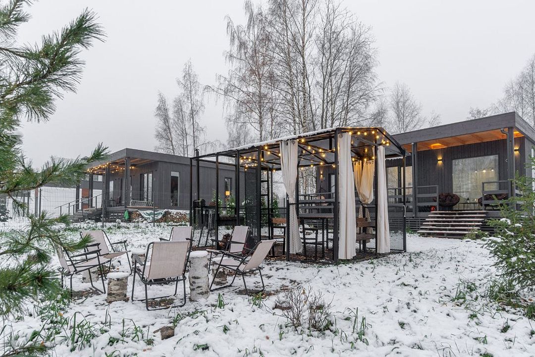 Каждый коттедж имеет собственный двор с беседкой, мангалом и живописным видом на леса Токсово.