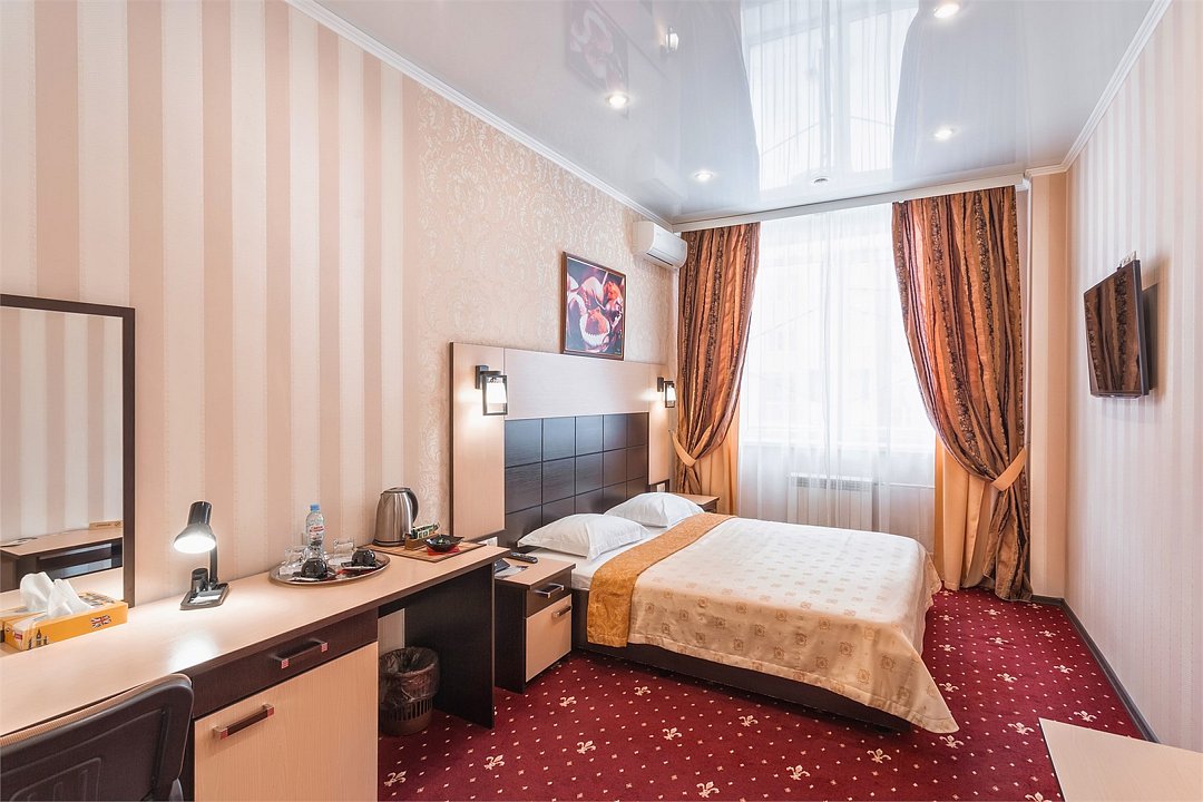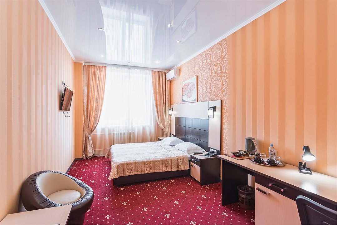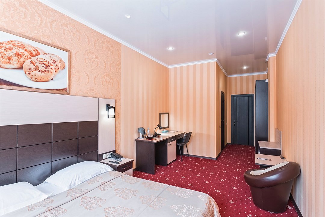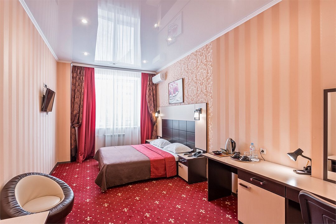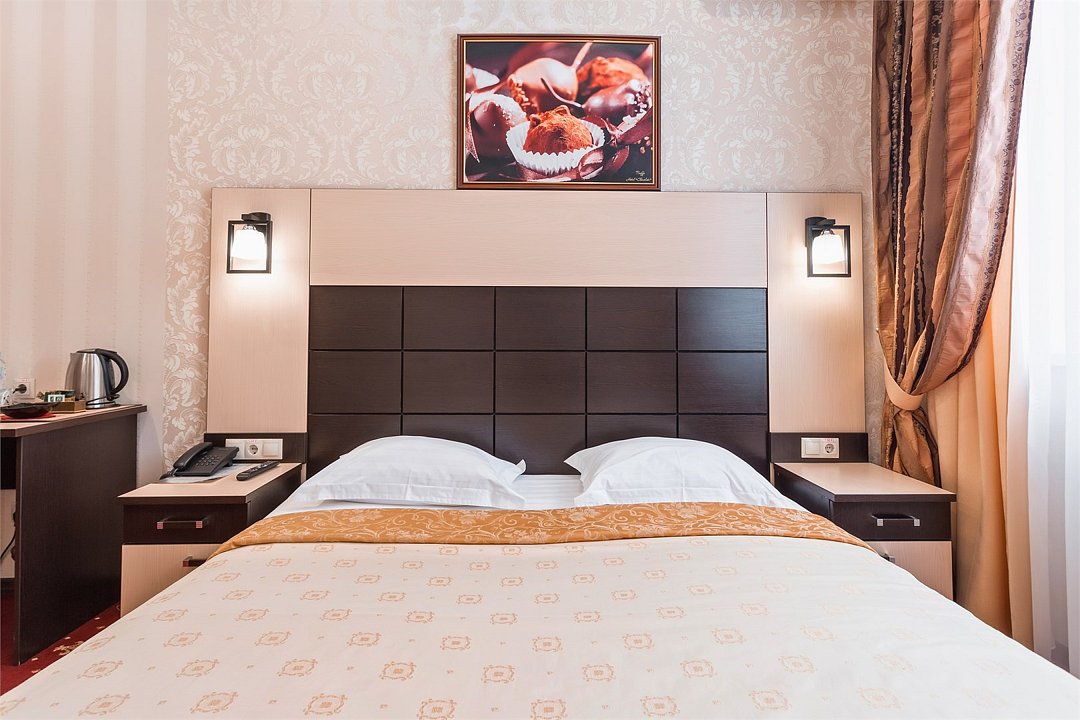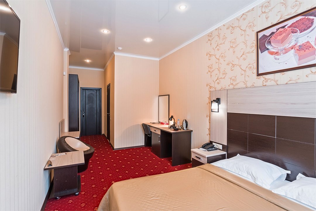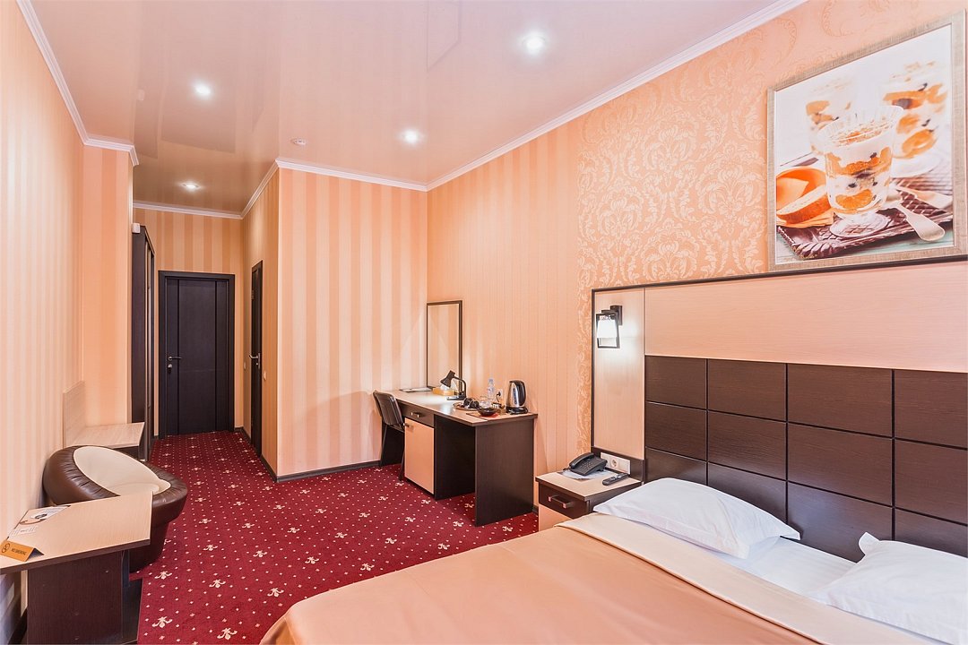 Уютный номер для размещения одного двух человек, площадью от 18 до 23 м2. В комнате: одна большая кровать, рабочая зона, стул, кресло, журнальный стол, мини-бар, чайник, сейф, телефон, настольная лампа, телевизор, багажница, шкаф-купе. В ванной комнате: туалет, душевая кабина с гидромассажем, косметическое зеркало, комплект полотенец, халат, тапочки, бесплатная продукция индивидуального пользования: мыло, шампунь, гель для душа, шапочка для душа. Комплимент от отеля - чай, кофе, сахар, вода в номере. Все номера оборудованы кондиционерами. На всей территории отеля и в каждом номере бесплатный Wi-Fi. Уборка номера, смена полотенец – ежедневно. В стоимость проживания входит завтрак по типу "шведский стол".Услуги и удобства