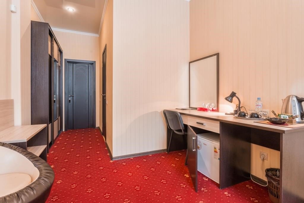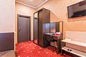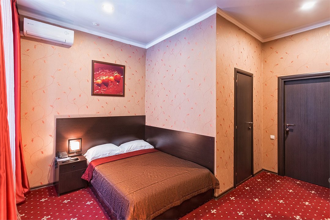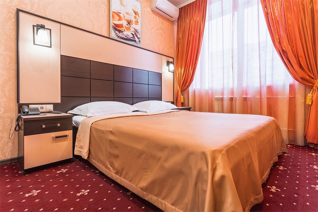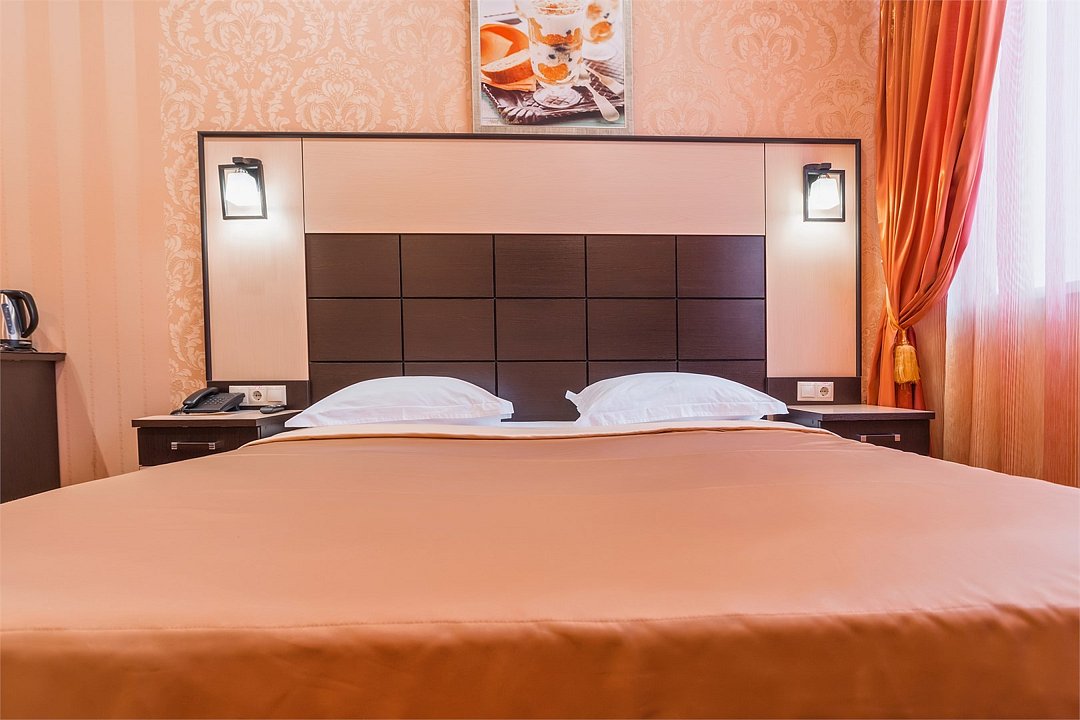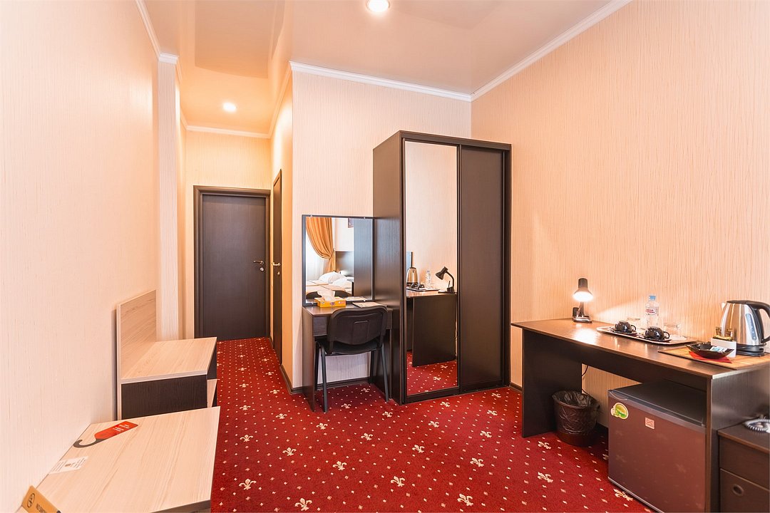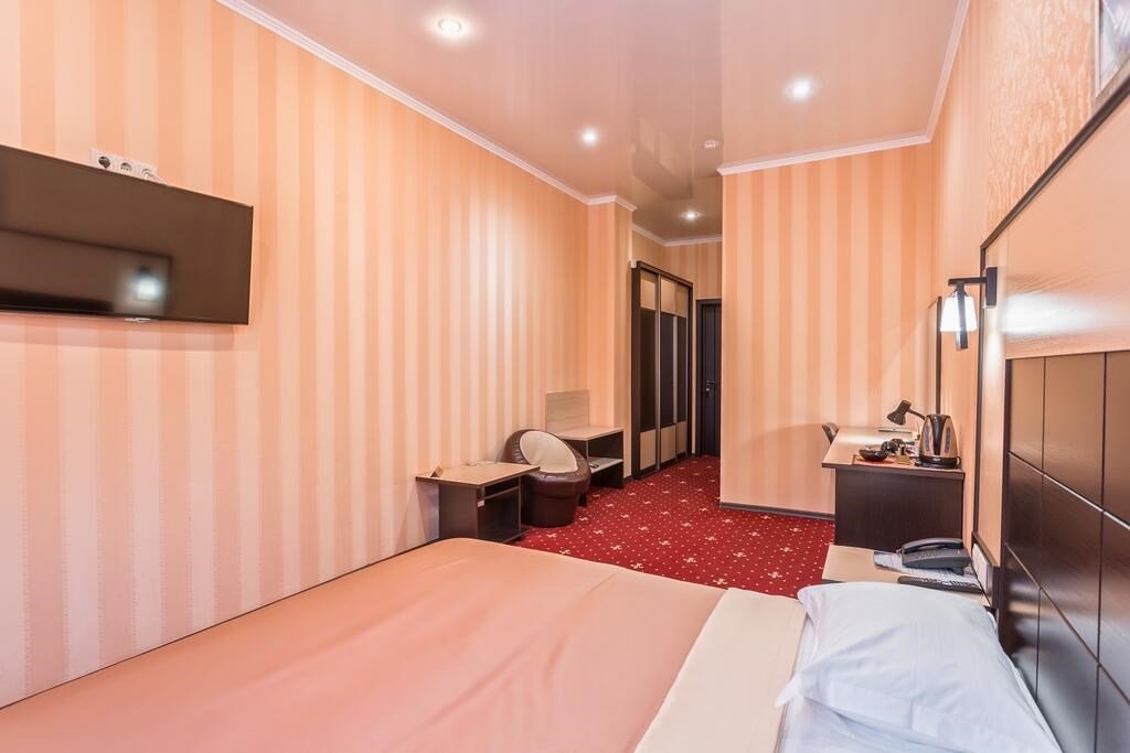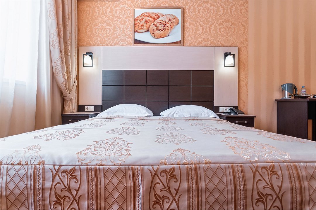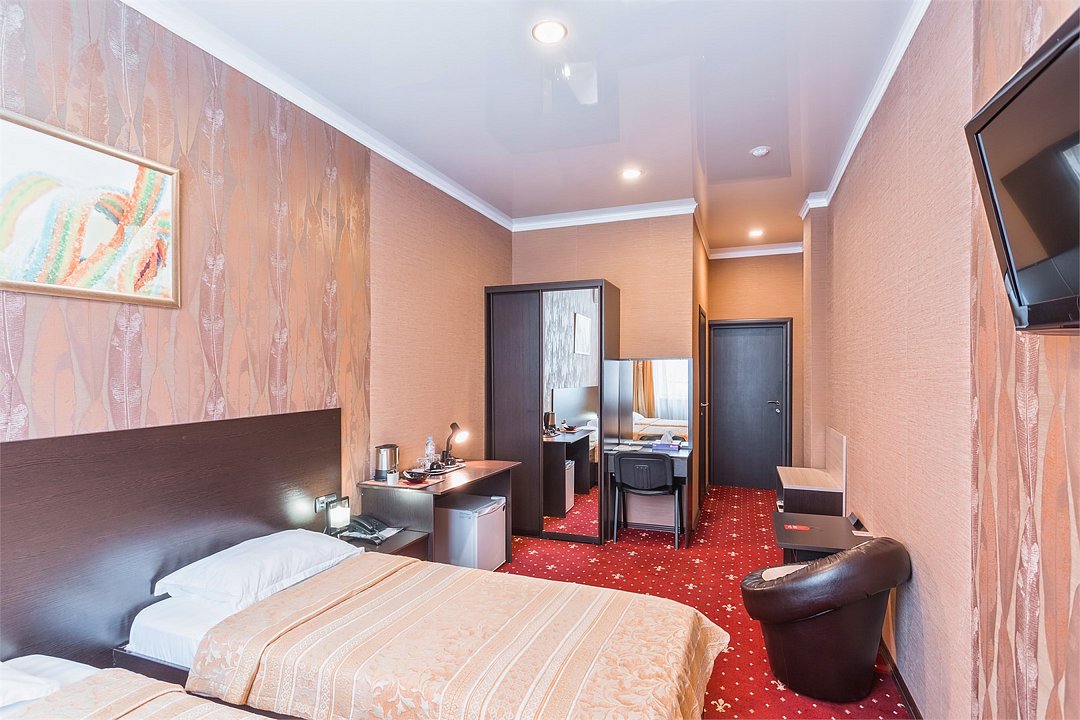 Уютный номер для размещения одного двух человек, площадью от 18 до 23 м2. В комнате: одна большая кровать, рабочая зона, стул, кресло, журнальный стол, мини-бар, чайник, сейф, телефон, настольная лампа, телевизор, багажница, шкаф-купе. В ванной комнате: туалет, душевая кабина с гидромассажем, косметическое зеркало, комплект полотенец, халат, тапочки, бесплатная продукция индивидуального пользования: мыло, шампунь, гель для душа, шапочка для душа. Комплимент от отеля - чай, кофе, сахар, вода в номере. Все номера оборудованы кондиционерами. На всей территории отеля и в каждом номере бесплатный Wi-Fi. Уборка номера, смена полотенец – ежедневно. В стоимость проживания входит завтрак по типу "шведский стол".Услуги и удобства