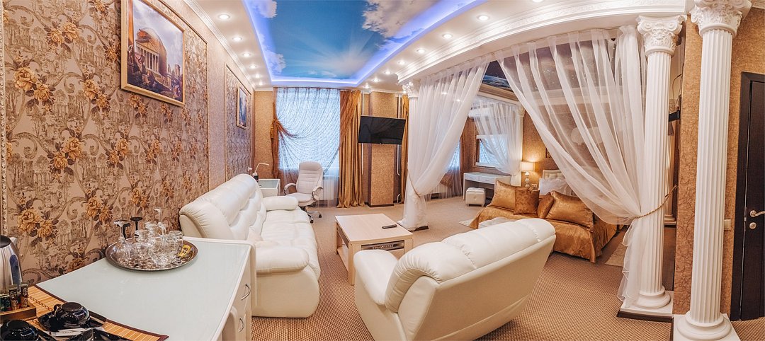 Просторный, роскошный, стильный номер, категории "Джуниор сюит" с интересным названием "Гелиос", для размещения одного двух человек, площадью 47 м2. В комнате: одна большая кровать с прикроватными тумбочками, рабочая зона с мягким рабочим креслом, настольная лампа, мягкая зона с журнальным столиком, мини-бар, чайник, кофе-машина, набор посуды, телефон, сейф, телевизор, багажница, шкаф-купе. В ванной комнате: туалет, биде, джакузи, фен, комплект полотенец, халат, тапочки, бесплатная продукция индивидуального пользования: мыло, шампунь, гель для душа, лосьон для тела, бальзам для волос, зубной набор. Комплимент от отеля - чай, кофе, сахар, вода в номере. Все номера оборудованы кондиционерами. Уборка номера, смена полотенец – ежедневно. Услуга Wi Fi бесплатна на всей территории отеля. В стоимость проживания входит завтрак по системе "шведский стол".Услуги и удобства