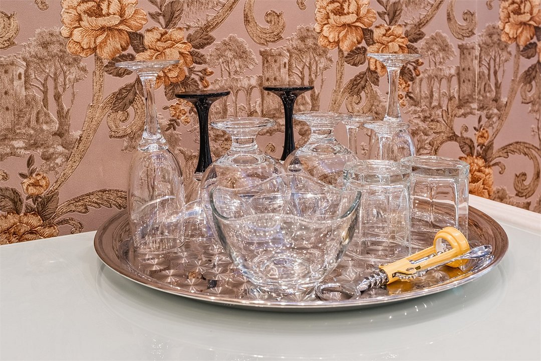 телевизор, кабельное телевидение, Wi-Fi, телефон, кондиционер, фен, ванна, кровать «Queen size», кресла, тумбы, стулья, шкаф для одежды, вешалки, письменный стол, зеркало, мини-бар, письменные принадлежности, чайный набор, набор посуды, обслуживание номеров, сейф, минеральная вода, чайник, косметическое зеркало, ковровое покрытие, отопление, вид во двор, высокие потолки, стаканы, номер для некурящихВ гостиничном номере