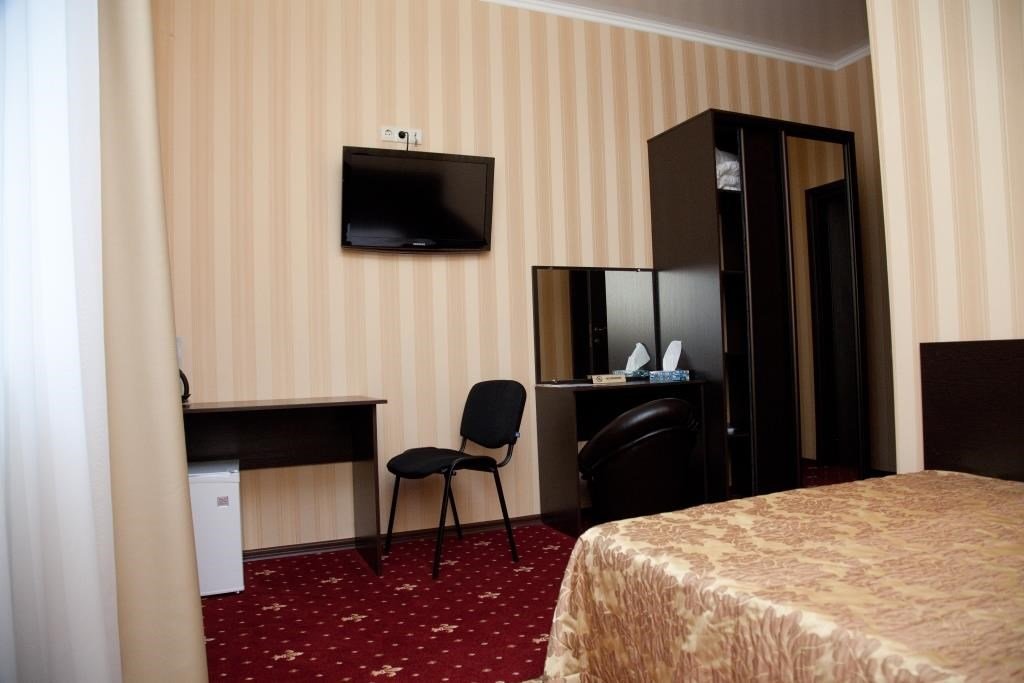 кабельное телевидение, Wi-Fi, телефон, кондиционер, фен, душевая кабина, теплый пол, банные принадлежности, банные полотенца, гигиенические средства, косметические средства, двуспальная кровать, шкаф для одежды, письменный стол, зеркало, мини-бар, чайный набор, обслуживание номеров, сейф, минеральная вода, чайник, косметическое зеркало, ковровое покрытие, отопление, кулер на этаже, кресло, вид во двор, стаканы, стул, стол, туалетные средства, телевизор с плоским экраном, мини-холодильник, шкаф-купе, номер для некурящихВ гостиничном номере