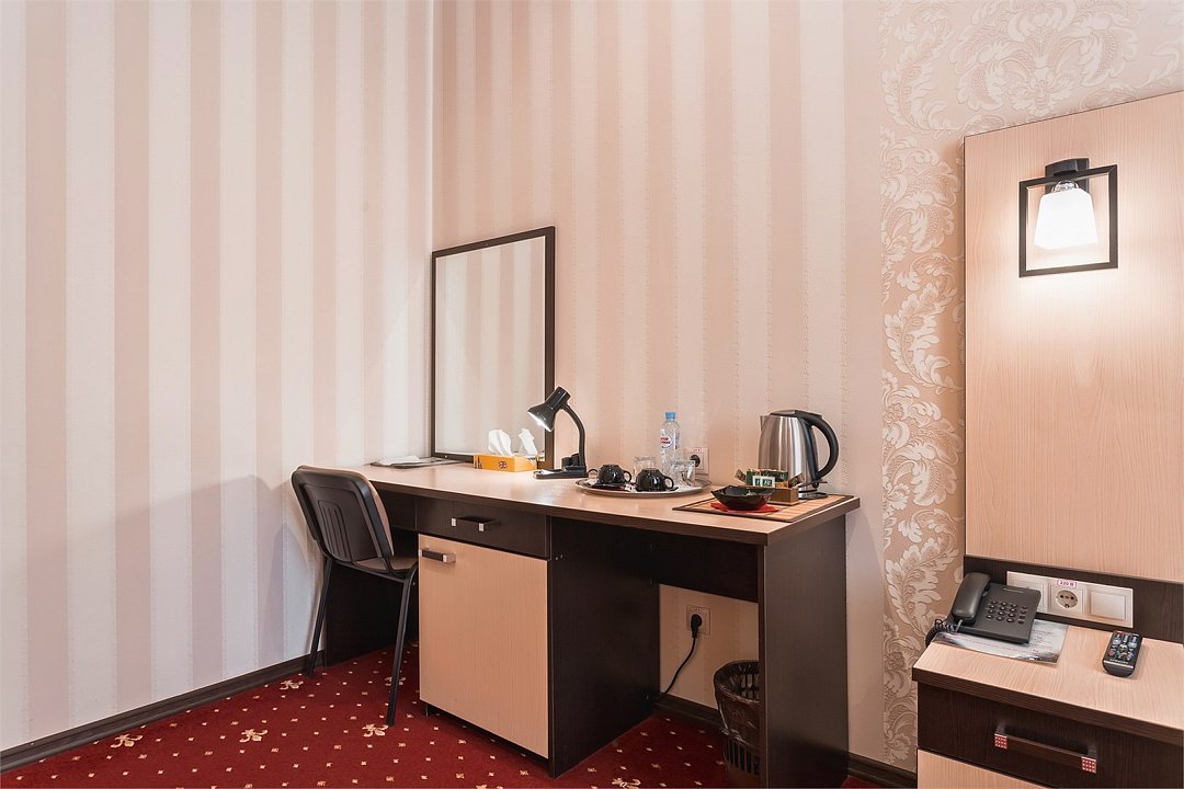 телевизор, кабельное телевидение, Wi-Fi, телефон, кондиционер, настольные лампы, фен, душевая кабина, теплый пол, банные принадлежности, банные полотенца, гигиенические средства, две полутораспальные кровати, письменный стол, зеркало, мини-бар, чайный набор, обслуживание номеров, сейф, минеральная вода, чайник, косметическое зеркало, ковровое покрытие, отопление, кулер на этаже, кресло, вид во двор, стаканы, стул, туалетные средства, мини-холодильник, шкаф-купе, номер для некурящихВ гостиничном номере