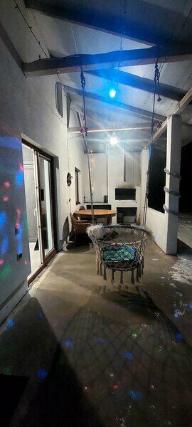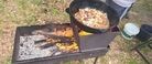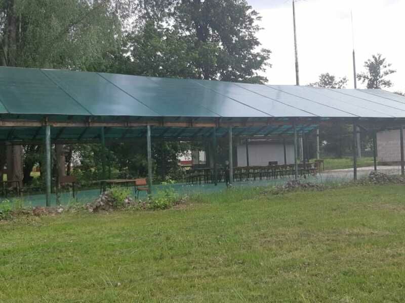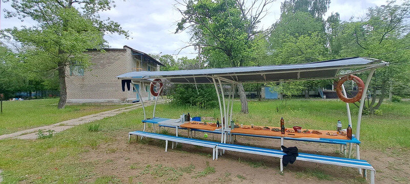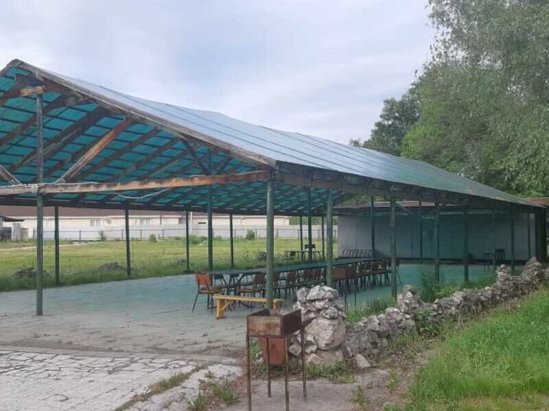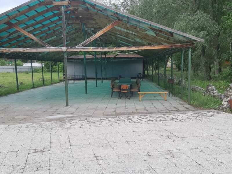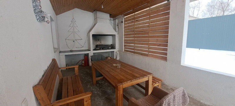 На улице находится мангал на улице с решеткой, столы и лавочки.
