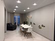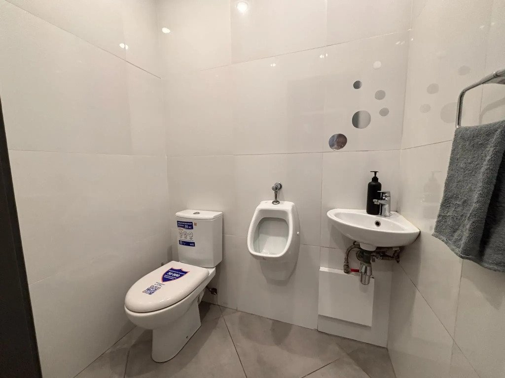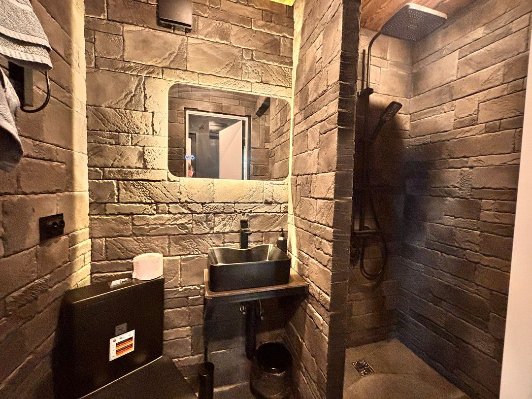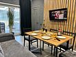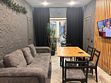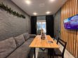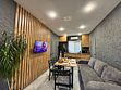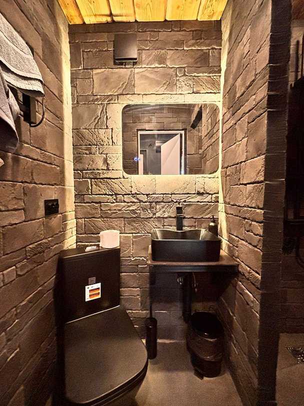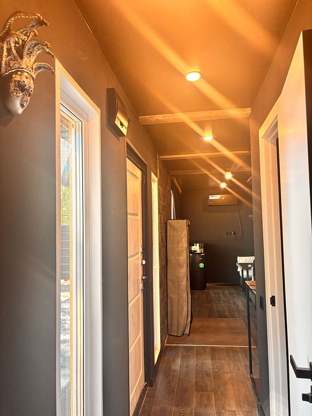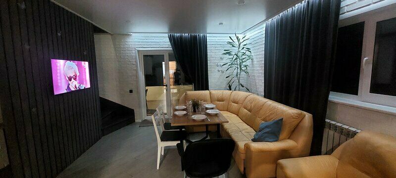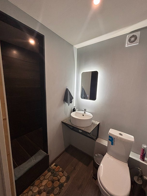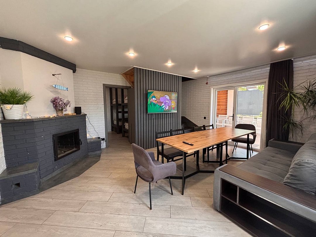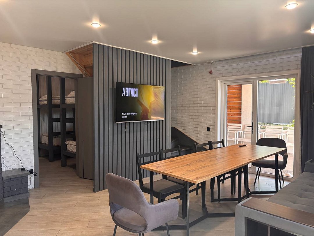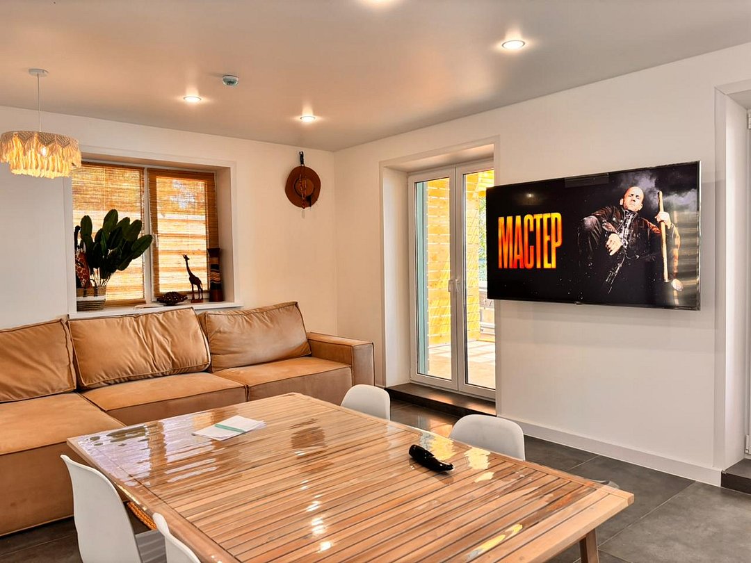 На 1-ом этаже гостиная с диваном, ТВ, Алиса колонка, Wi-Fi, кухня со всем необходимым (холодильник, чайник, микроволновка, посуда, приборы, кастрюля, сковородка).