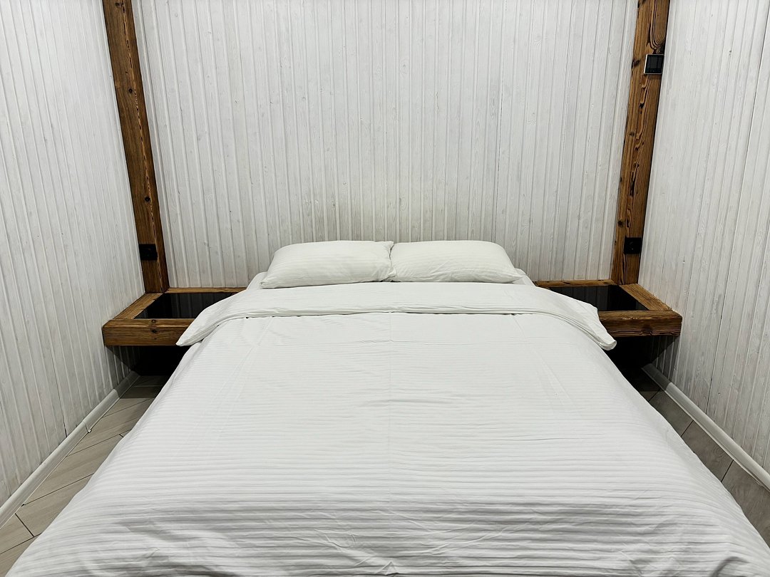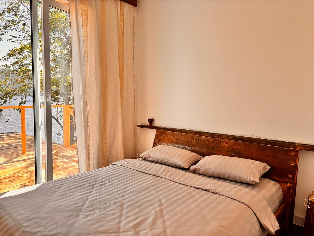 Четырехместный с баней. В доме 1 спальня и гостиная, имеется кухня.
