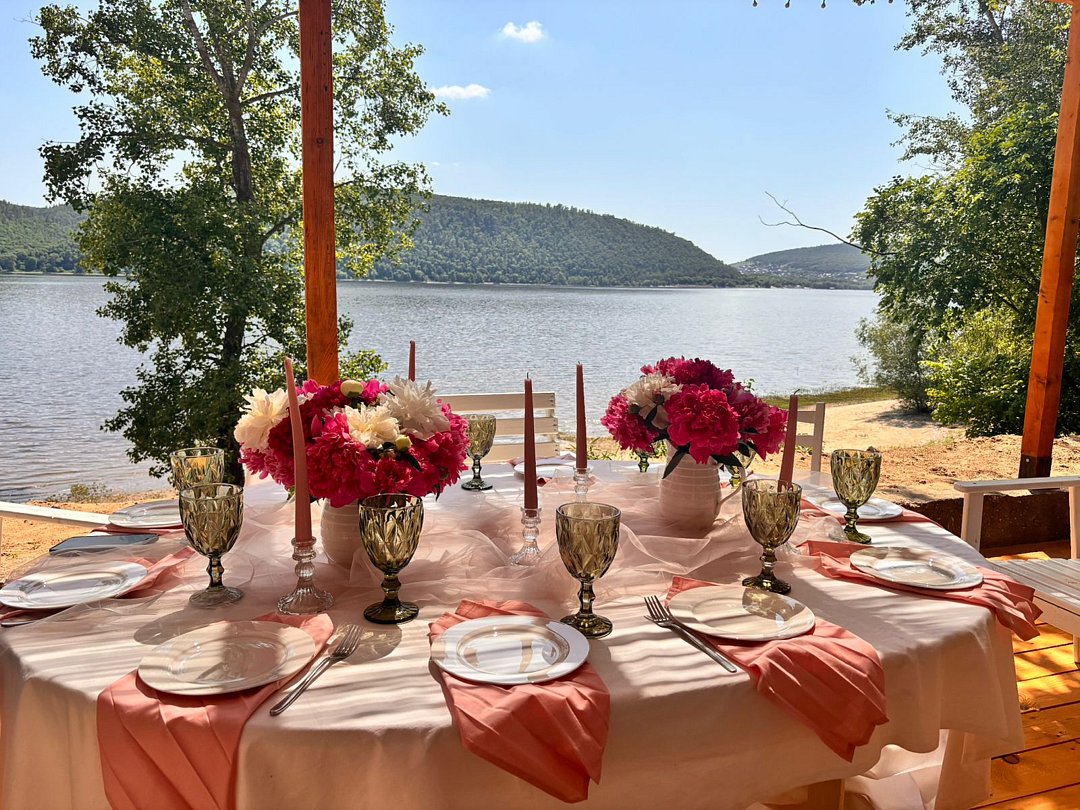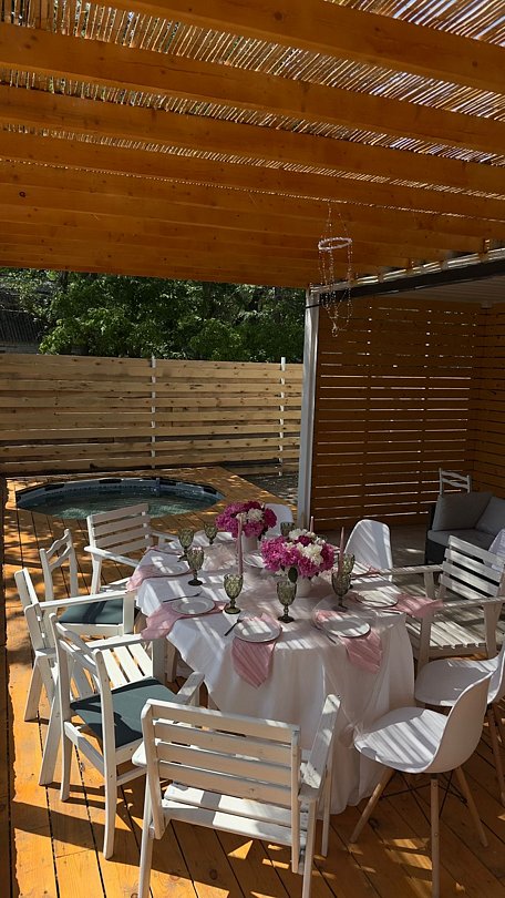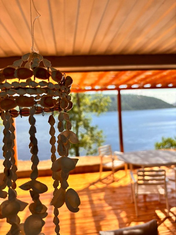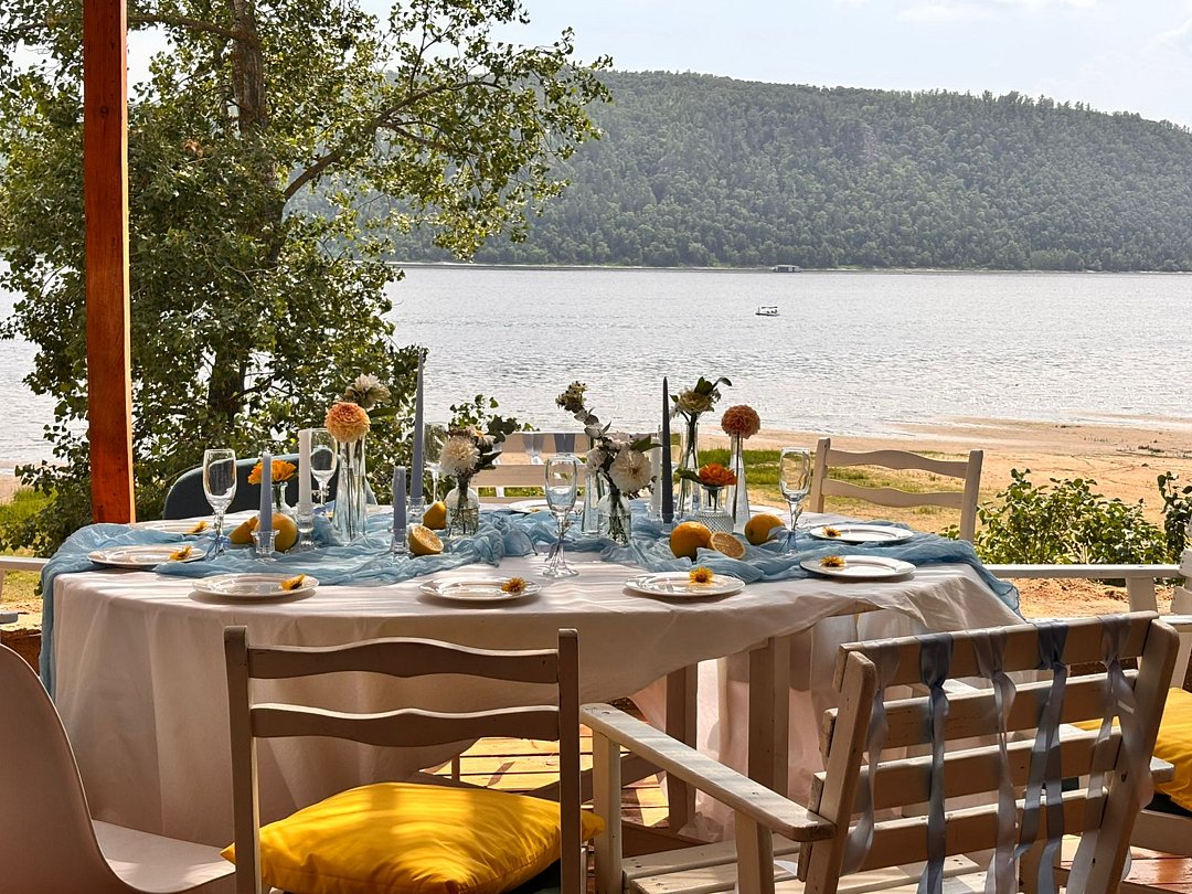 Банный комплекс с сауной и бассейном. Витражи на Волгу из столовой. Веранда, закрытая от дождя и жары, с мангалом, решеткой. Есть казан за дополнительную плату.