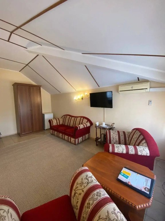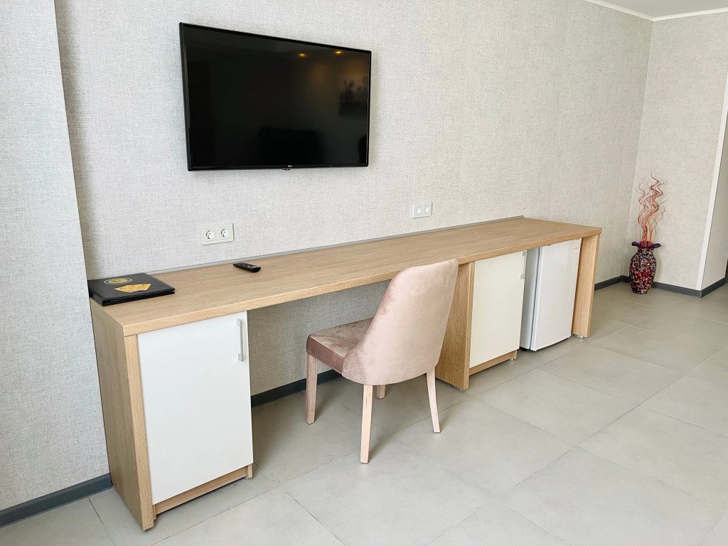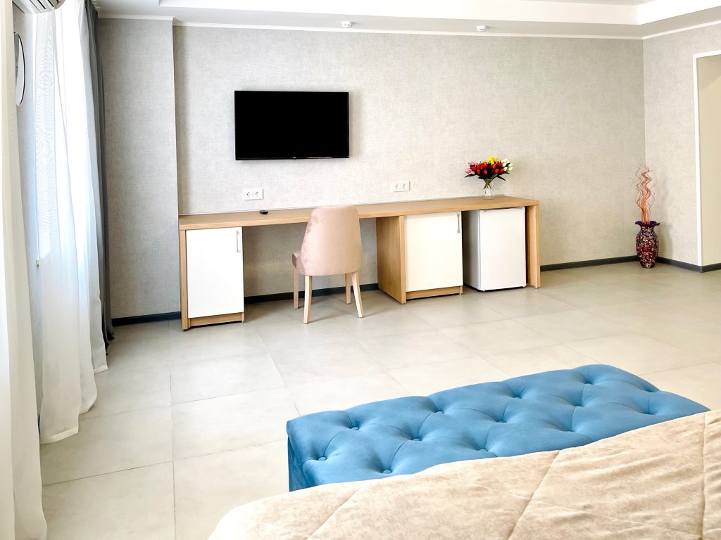 Обеденная зона, кондиционер, чайник, телевизор, шкаф для одежды, прихожая. В Ванной комнате душ, биде. Фен, утюг по запросу. Номер без окон.
