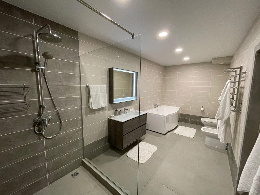 В каждой комнате душевая кабина или ванная, кондиционер. В гостиной: обеденная зона, кожаный диван, кухонный гарнитур, холодильник, микроволновая печь, телевизор. Фен, утюг по запросу.