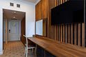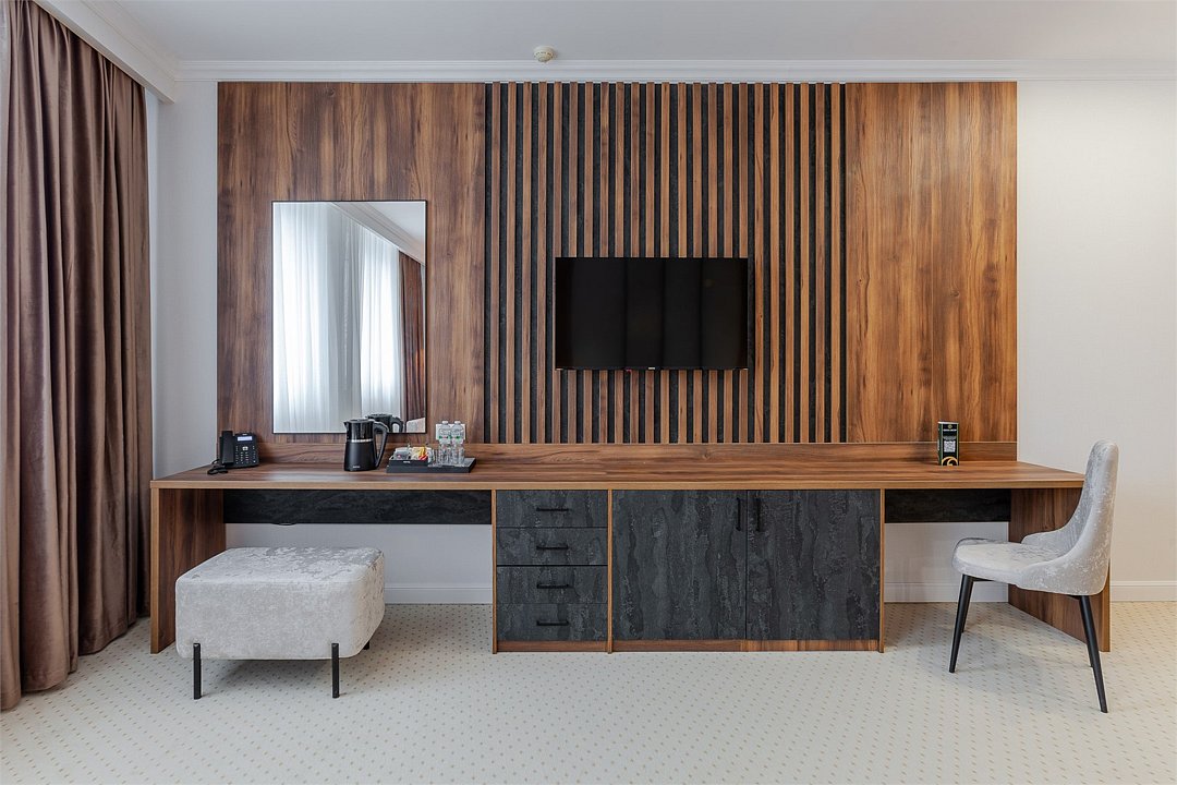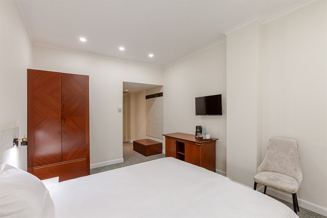 телевизор, Wi-Fi, телефон, холодильник, фен, утюг, душевая кабина, гигиенические средства, две односпальные или большая двуспальная кровать, шкаф для одежды, сейф, чайник, раковина, вид на город, тумба, туалет, фанкойлВ номере