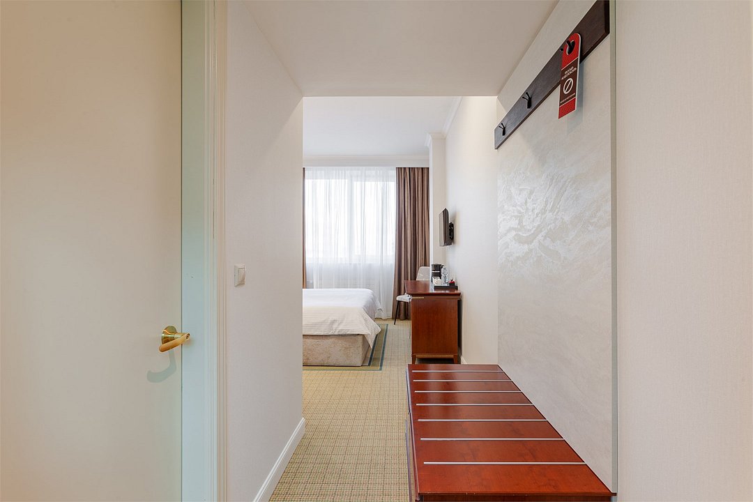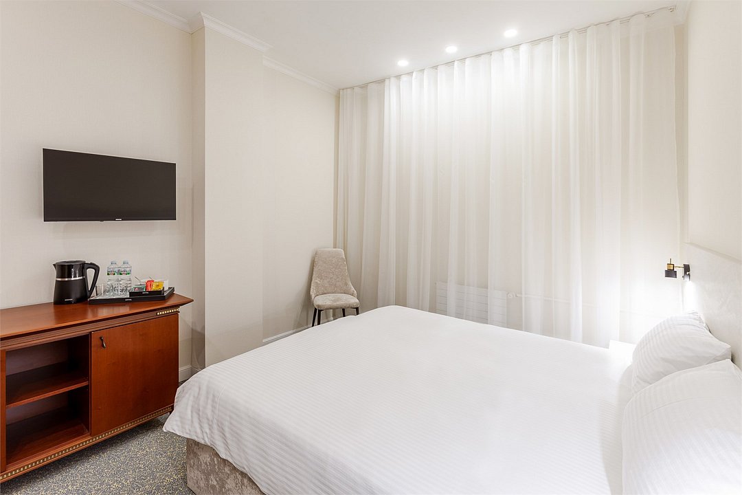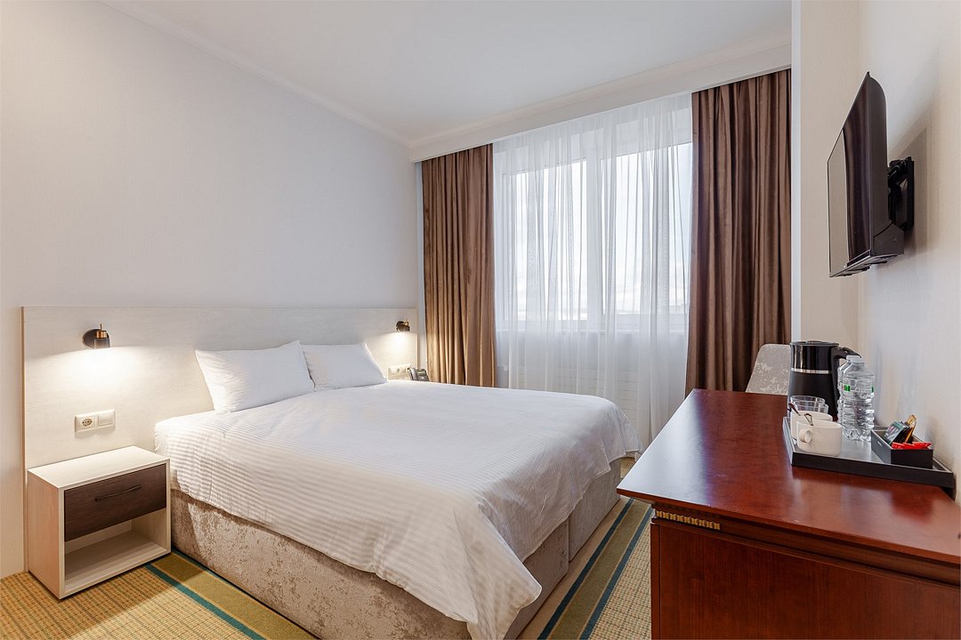 Номер «Стандарт эконом» -это идеальное сочетание комфорта и функциональности, отлично подойдет для пар или тех, кто ценит практичность и порядок. Площадь номера 16-18 кв. м. В номере есть все для комфортного размещения: на ваш выбор предоставляется одна двуспальная кровать или две раздельные односпальные кровати, шкаф, прикроватная тумба и удобная прихожая с вешалкой для одежды, обувницей и аксессуарами для ухода за обувью. В номере установлен телевизор с плоским экраном, холодильник, утюг и гладильная доска, телефон и сейф для ценных вещей, электрический чайник и набор посуды (2 чашки, 2 стакана, ложки). Современная система Fankol обеспечивает комфортную температуру в номере в любое время года. В собственной ванной комнате Вас ожидает набор полотенец, тапочки гигиенические принадлежности и идеально чистая сантехника, шампунь, гель для душа, мыло и фен.Услуги и удобства