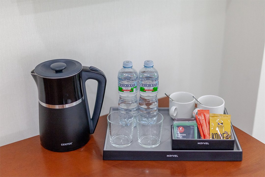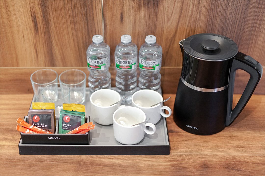 Wi-Fi, телефон, холодильник, фен, утюг, душевая кабина, тапочки, гигиенические средства, две односпальные или большая двуспальная кровать, шкаф для одежды, сейф, чайник, раковина, тумба, туалет, телевизор с плоским экраном, фанкойлВ номере