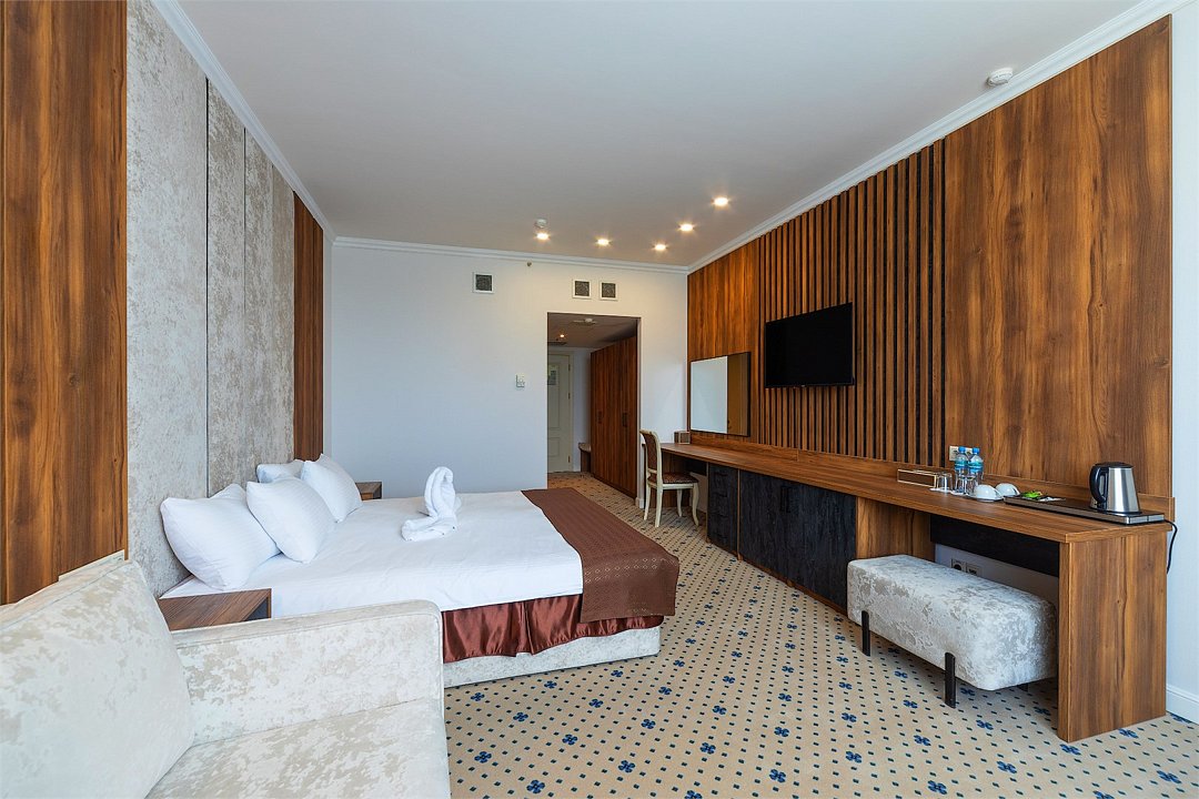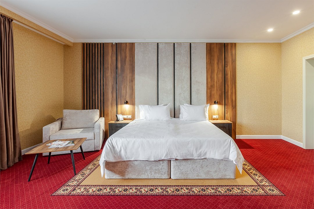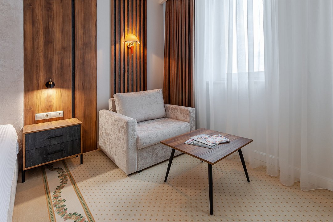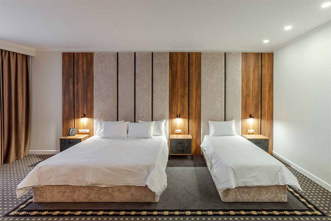 Уютный номер категории "Стандарт", созданный для вашего комфортного пребывания. Просторная площадь от 34 до 40 квадратных метров позволит вам расслабиться и насладиться отдыхом. В номере вас ждет современная техника для вашего удобства: телевизор с плоским экраном и доступом к кабельным каналам, а также бесплатный Wi-Fi для поддержания связи. Для поддержания комфортной температуры в любое время года предусмотрен кондиционер и сплит-система. В вашем распоряжении также фен, светильник, будильник, утюг и гладильная доска, чтобы вы всегда выглядели безупречно. Мини-холодильник позволит сохранить напитки и легкие закуски прохладными. Ванная комната оборудована всем необходимым: душ (включая душевую кабину), раковина, унитаз и биде. Мы позаботились о вашем комфорте, предоставив банные полотенца, халаты, тапочки и полный набор гигиенических и косметических средств. Из окна номера открывается спокойный вид во двор, что гарантирует тишину и умиротворение. Для вашего сна мы предлагаем выбор между двумя удобными односпальными кроватями или одной большой двуспальной кроватью. Мебель в номере включает вместительную гардеробную, зеркало, комфортное кресло и диван, а также стулья. Для вашего удобства предусмотрены вешалки. Дополнительные удобства включают сейф для хранения ценных вещей, обслуживание номеров, чайный набор с чайником и стаканами, а также косметическое зеркало. В номере поддерживается отопление, а ежедневная уборка номера гарантирует чистоту и порядок. Обратите внимание, что при необходимости возможно размещение дополнительного гостя на раскладном диване за отдельную плату.Услуги и удобства