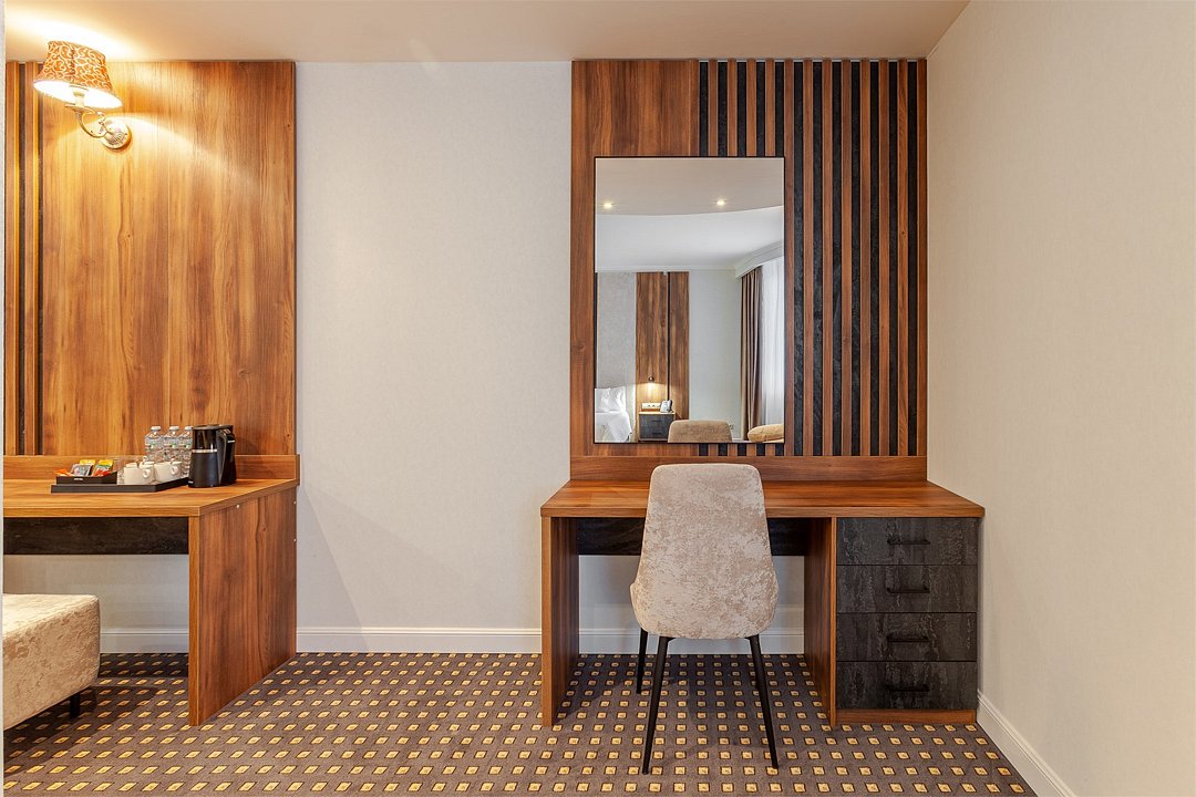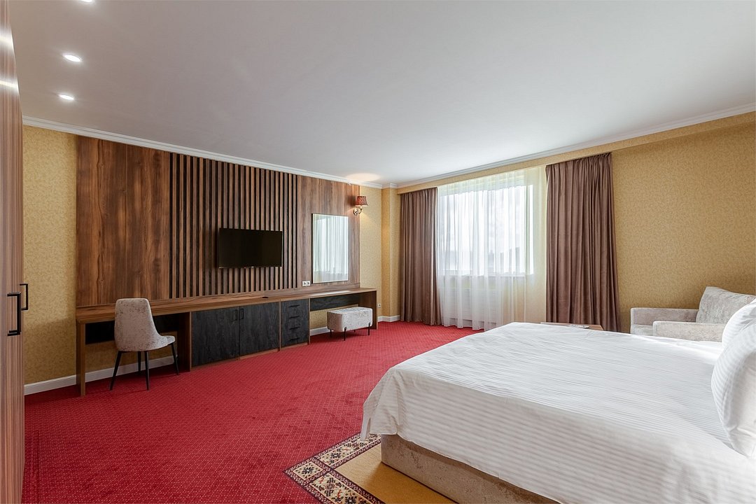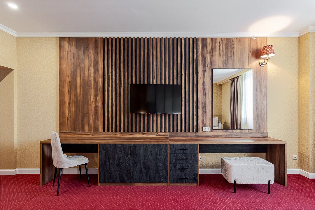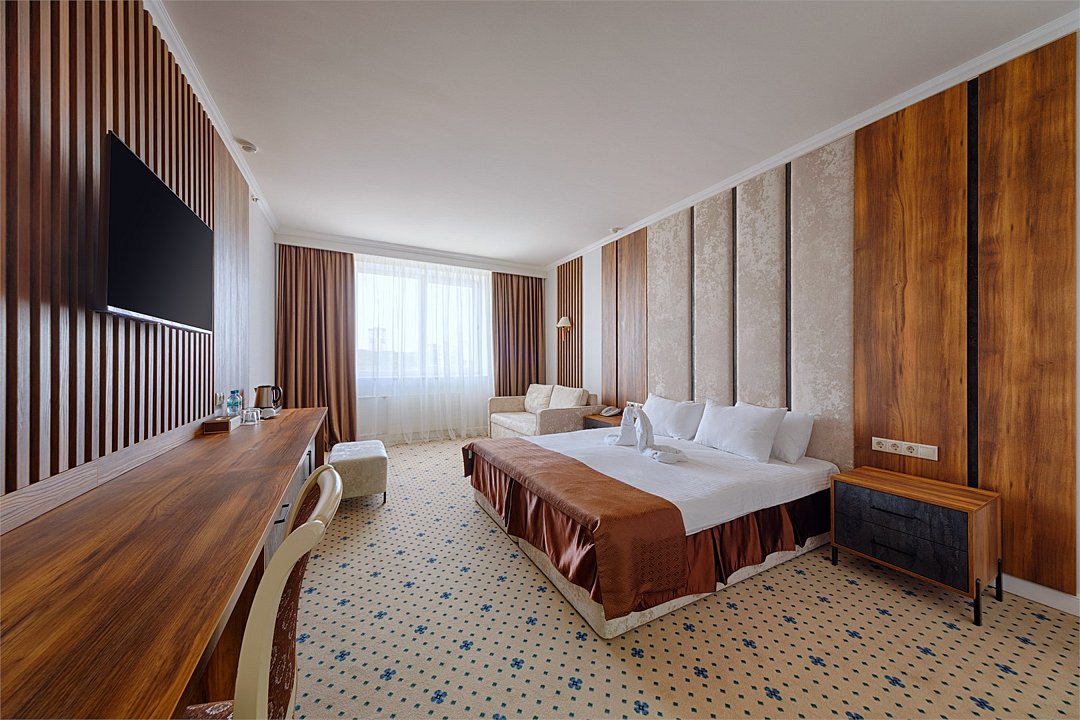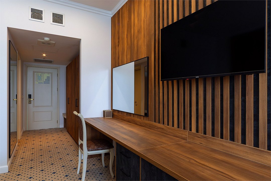 Уютный номер категории "Стандарт", созданный для вашего комфортного пребывания. Просторная площадь от 34 до 40 квадратных метров позволит вам расслабиться и насладиться отдыхом. В номере вас ждет современная техника для вашего удобства: телевизор с плоским экраном и доступом к кабельным каналам, а также бесплатный Wi-Fi для поддержания связи. Для поддержания комфортной температуры в любое время года предусмотрен кондиционер и сплит-система. В вашем распоряжении также фен, светильник, будильник, утюг и гладильная доска, чтобы вы всегда выглядели безупречно. Мини-холодильник позволит сохранить напитки и легкие закуски прохладными. Ванная комната оборудована всем необходимым: душ (включая душевую кабину), раковина, унитаз и биде. Мы позаботились о вашем комфорте, предоставив банные полотенца, халаты, тапочки и полный набор гигиенических и косметических средств. Из окна номера открывается спокойный вид во двор, что гарантирует тишину и умиротворение. Для вашего сна мы предлагаем выбор между двумя удобными односпальными кроватями или одной большой двуспальной кроватью. Мебель в номере включает вместительную гардеробную, зеркало, комфортное кресло и диван, а также стулья. Для вашего удобства предусмотрены вешалки. Дополнительные удобства включают сейф для хранения ценных вещей, обслуживание номеров, чайный набор с чайником и стаканами, а также косметическое зеркало. В номере поддерживается отопление, а ежедневная уборка номера гарантирует чистоту и порядок. Обратите внимание, что при необходимости возможно размещение дополнительного гостя на раскладном диване за отдельную плату.Услуги и удобства