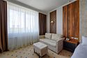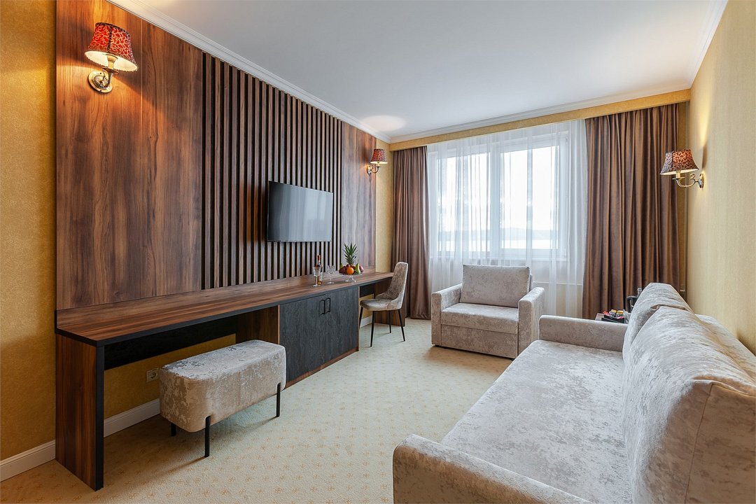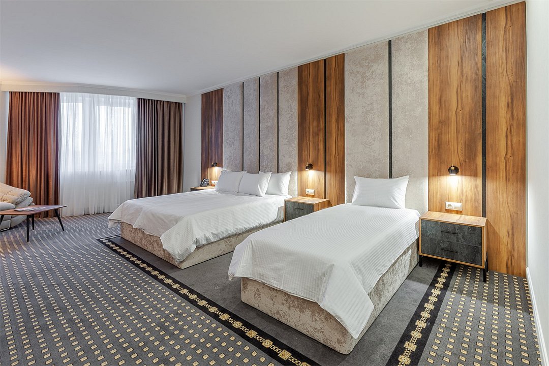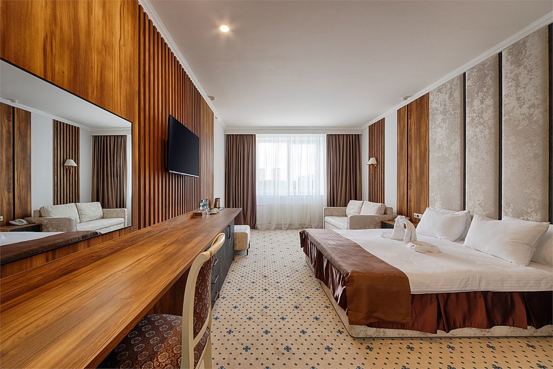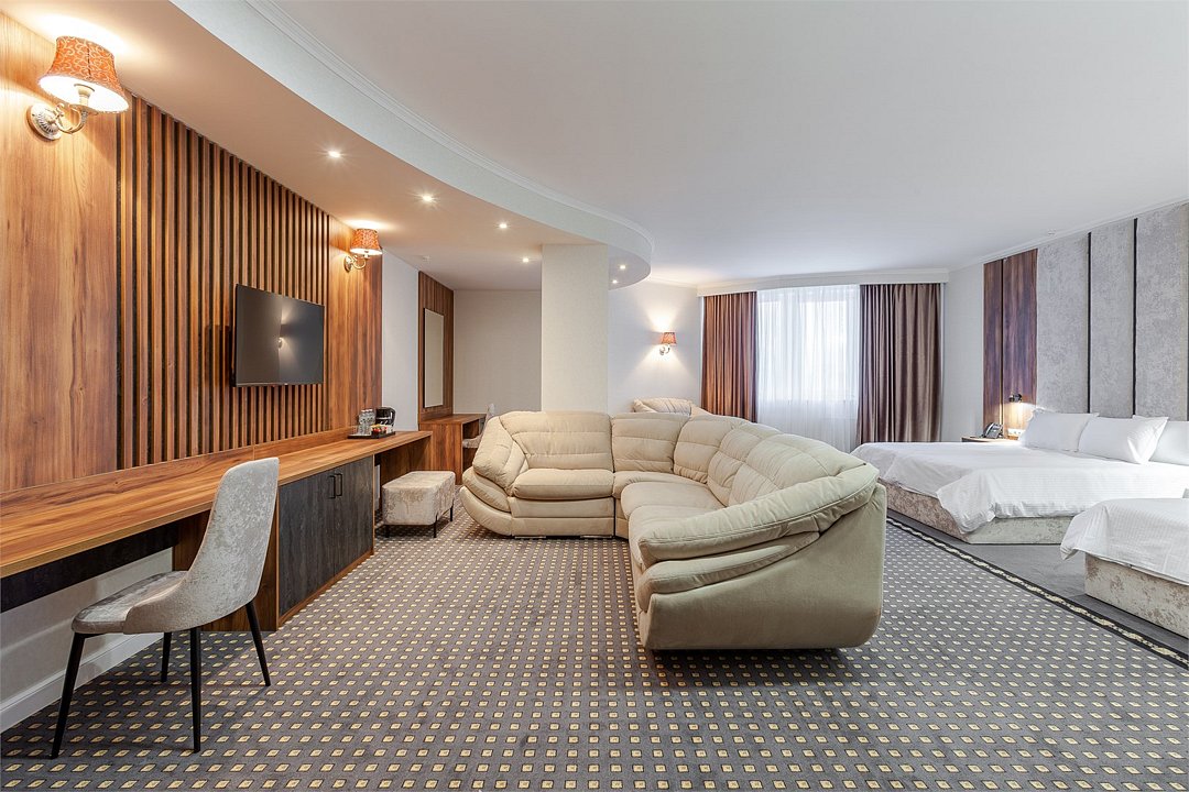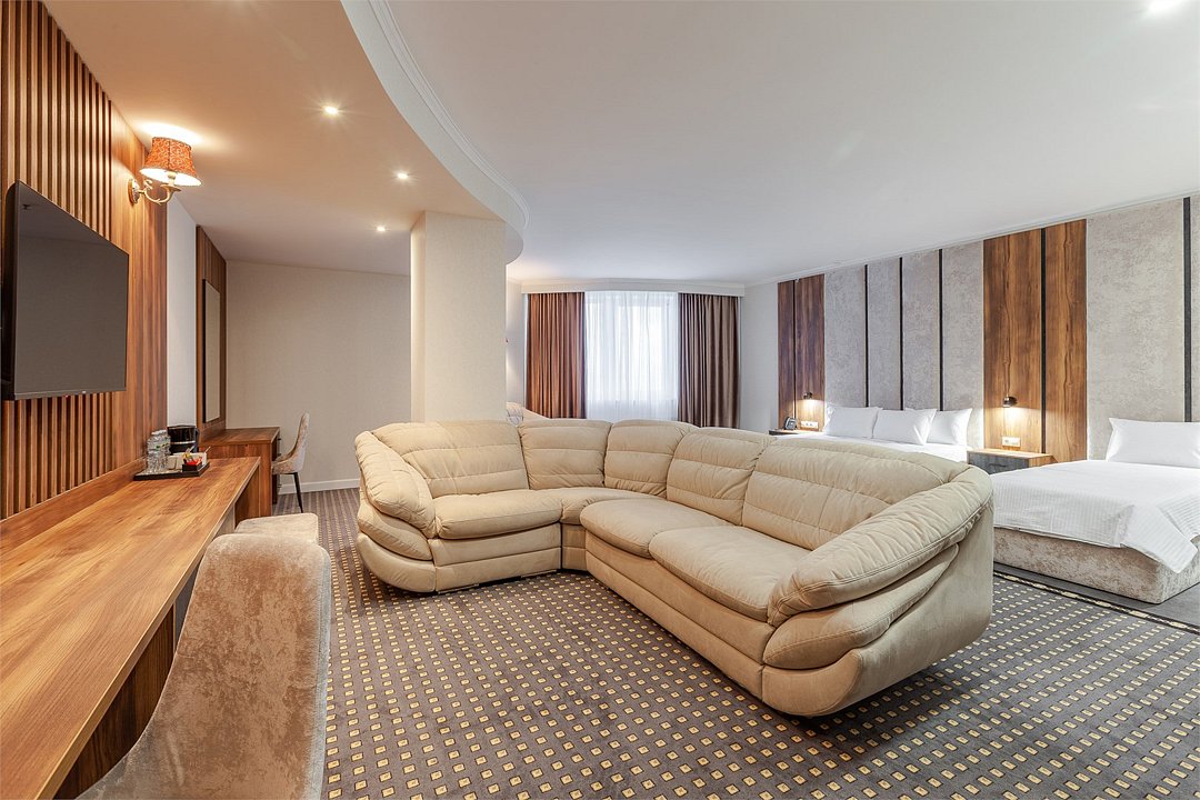 Семейный номер (60-70 кв.м.) Просторный номер для семьи с двумя кроватями (двуспальной и односпальной) и дополнительными местами для отдыха. В номере есть все для комфортного проживания: гостиная зона с угловым диваном, рабочий стол, телевизор, холодильник и климат-контроль. Ванная комната укомплектована халатами, тапочками и гигиеническими наборами. Для вашего удобства предоставляются сейф, утюг с доской, чайник и посуда. Из окон открывается вид на городУслуги и удобства