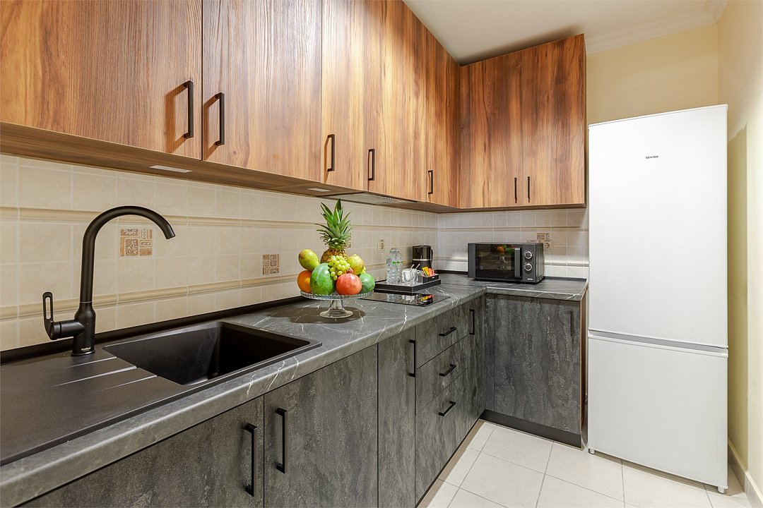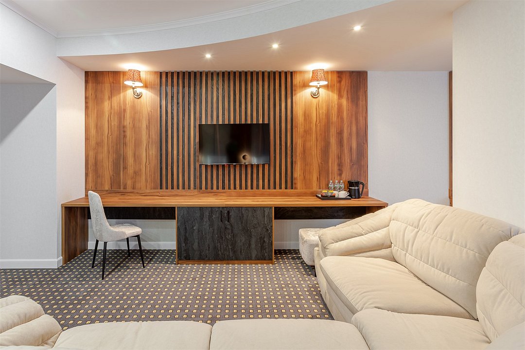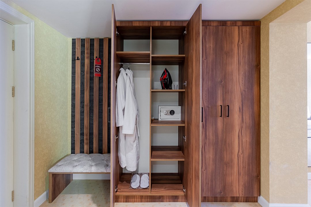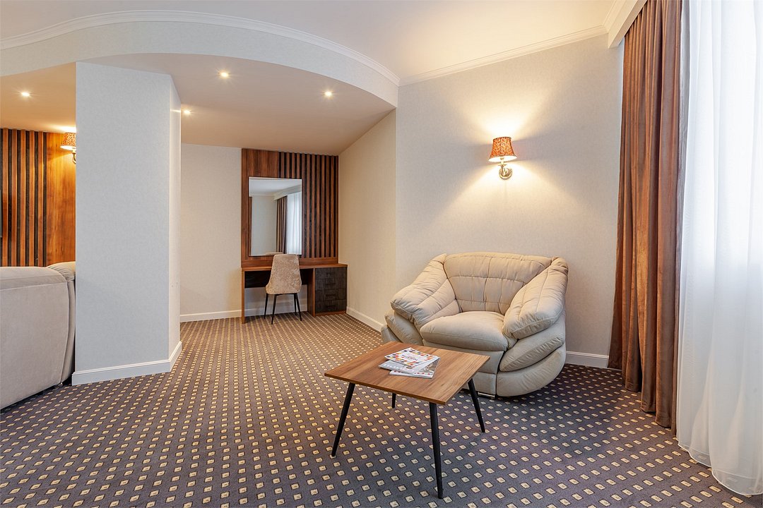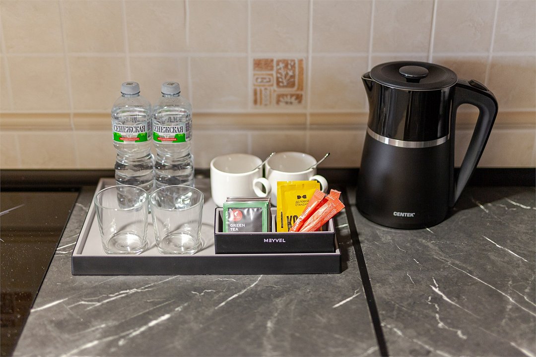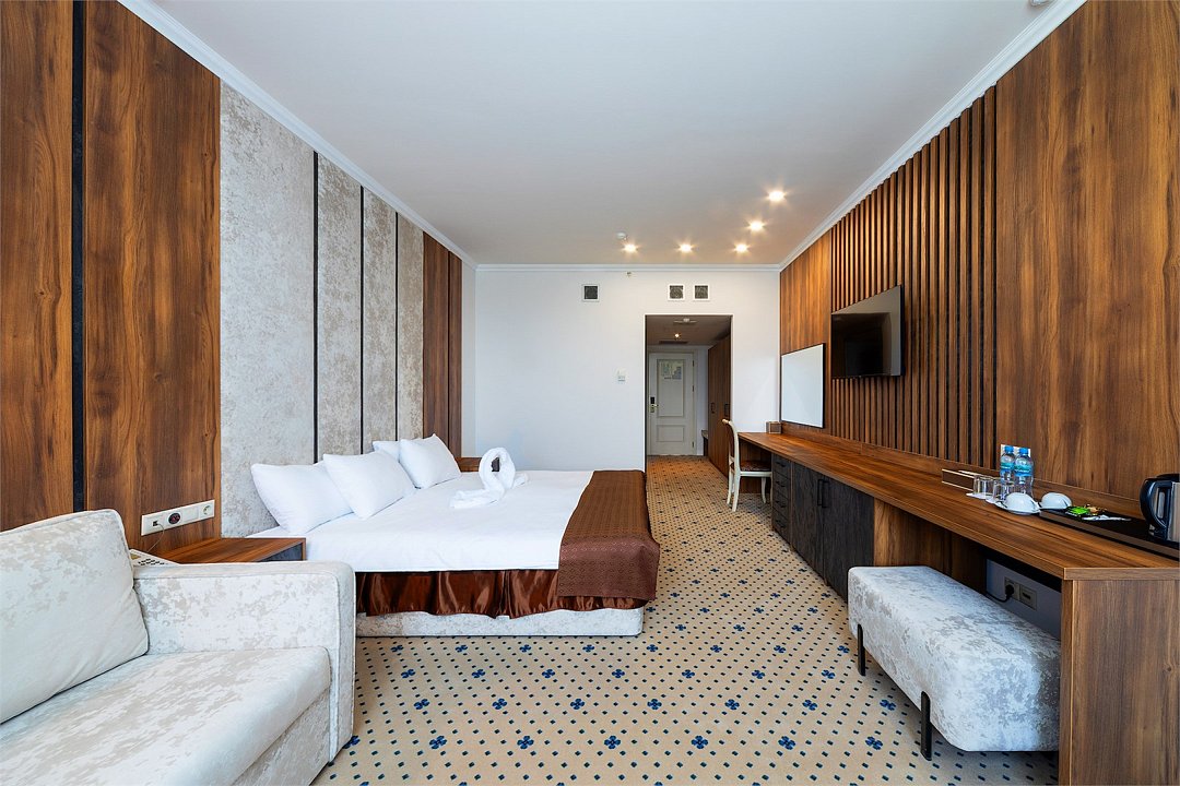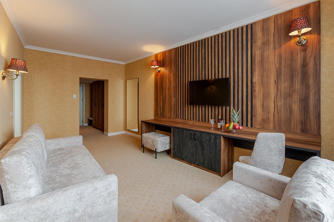 Просторный номер с собственной кухней и выбором кроватей (двуспальная или две раздельные). Идеальный выбор для тех, кто ценит комфорт самостоятельного путешествия и не хочет жертвовать эстетикой. Площадь номера 33-35 кв. м. грамотно организована и включает уютную спальную зону и гостиную зону с удобным креслом-кроватью, журнальным столиком и пуфиком. В зоне кухни Вас ждет все необходимое для приготовления любимых блюд: холодильник, электрический чайник и полноценный набор посуды и кухонной утвари (сковороды, кастрюли, терки, столовые приборы и даже штопор). Функциональная прихожая оснащена вешалкой для одежды, обувницей и всеми аксессуарами для ухода за гардеробом (рожок, щетка и губка для обуви). В номере установлен телевизор с плоским экраном, утюг и гладильная доска, телефон и сейф для ценных вещей. Современная система Fankol обеспечивает комфортную температуру в номере в любое время года. В собственной ванной комнате Вас ожидает набор полотенец, тапочки гигиенические принадлежности и идеально чистая сантехника, шампунь, гель для душа, мыло и фен.Услуги и удобства