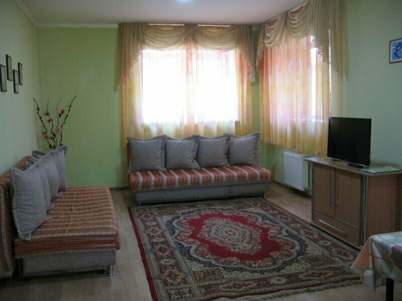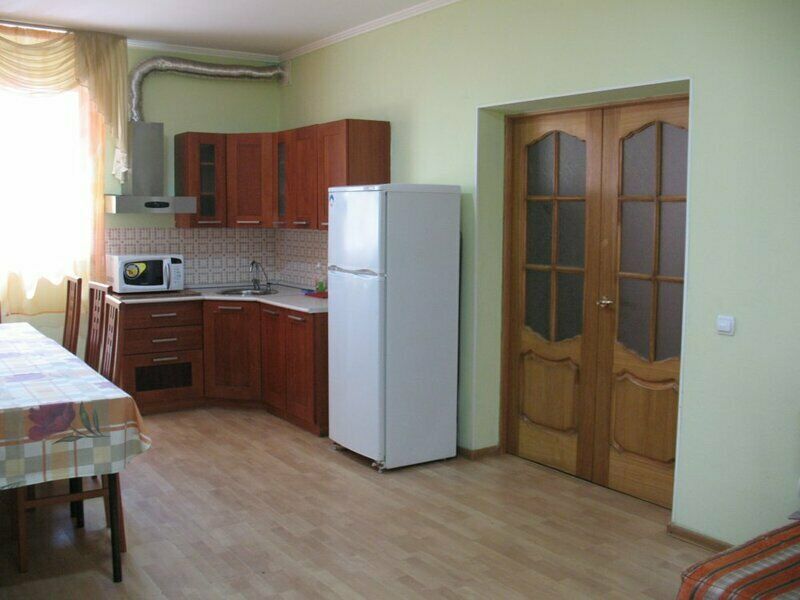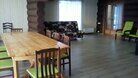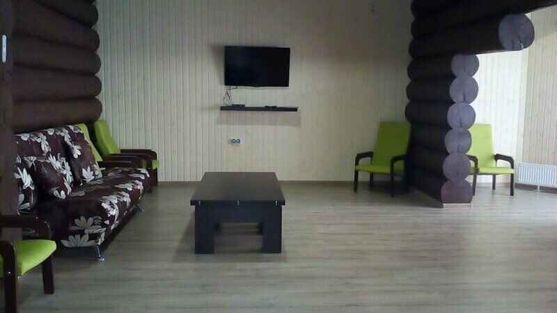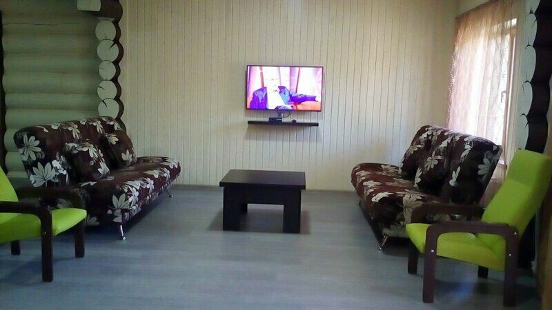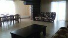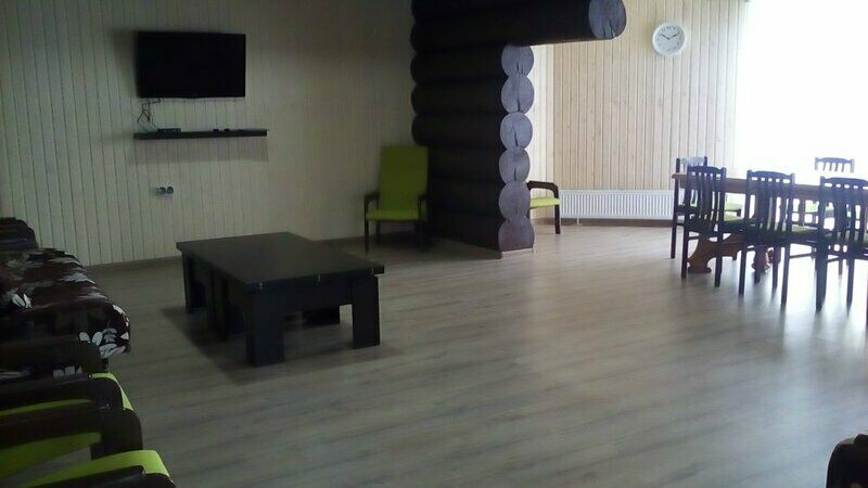 - гостиная совместно с кухней, в которой стоят 2 дивана, телевизор, большой обеденный стол, микроволновка, холодильник, чайник, посуда на 12 персон