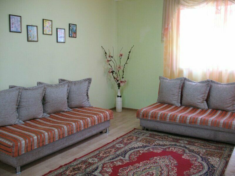 2 комнаты (в гостиной — диван, кухонная зона, в спальне – 2 двуспальные кровати)