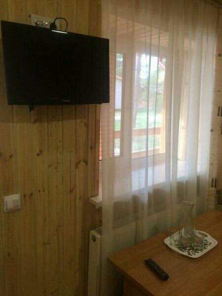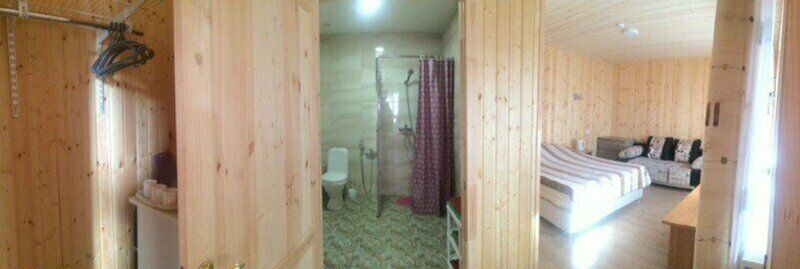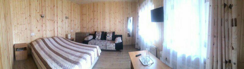 В номере: стоит двуспальная кровать, раскладывающийся диван, холодильник, телевизор, встроенный шкаф-купе, ванная комната с душем и туалетом, открытая и закрытая веранда.