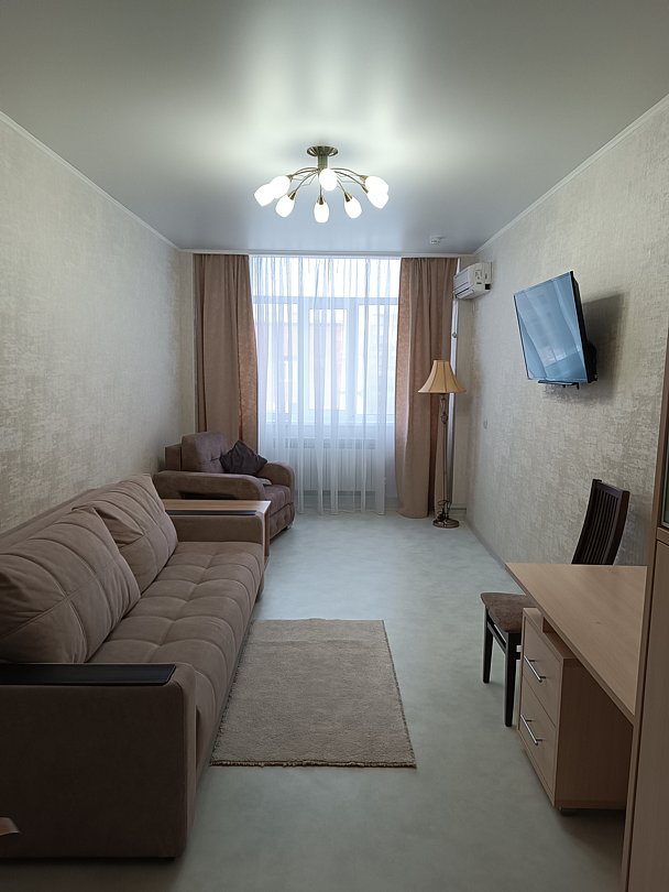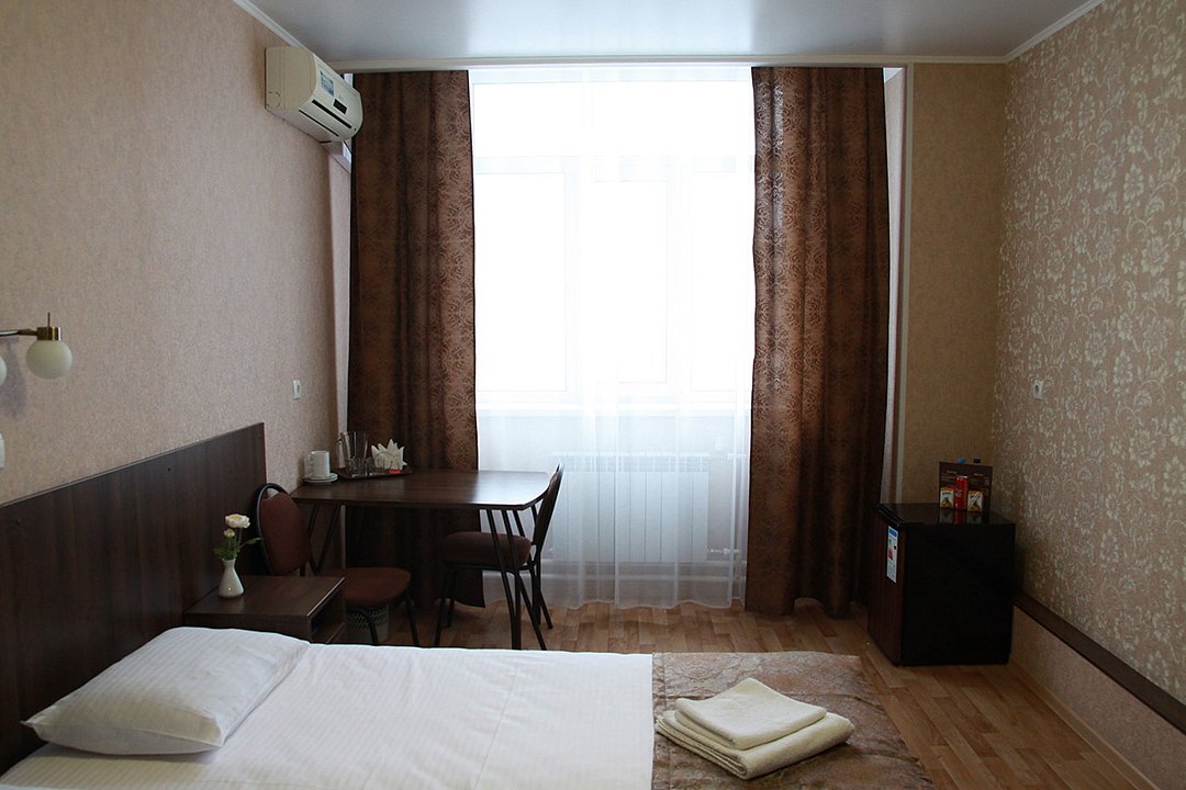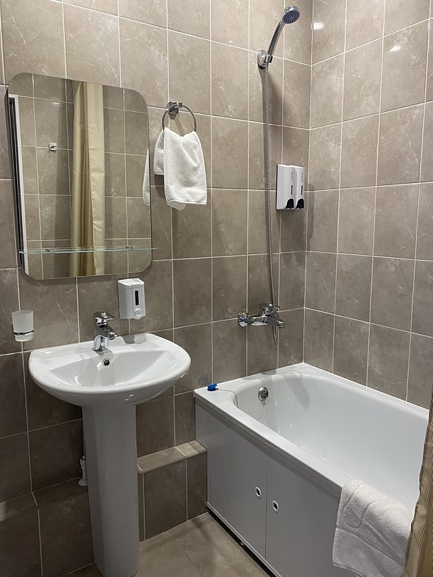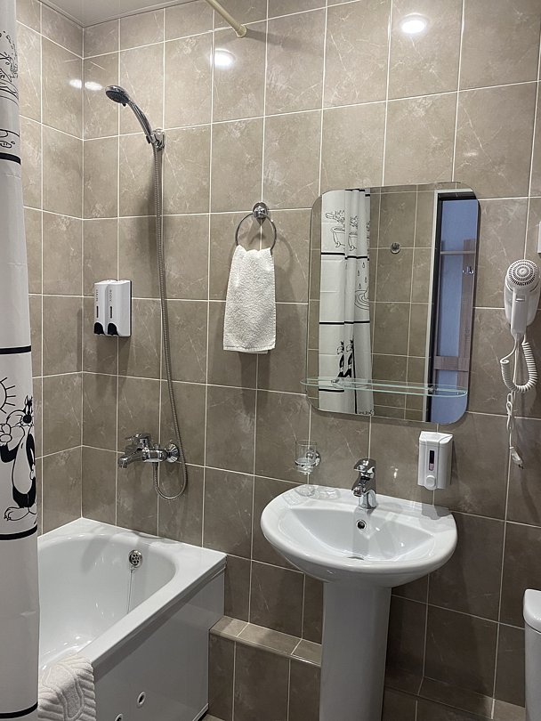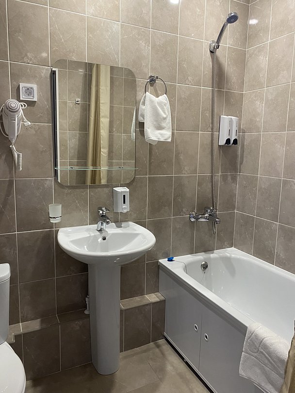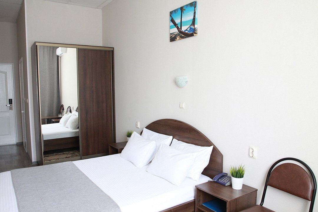 В номере есть телевизор, телефон, холодильник, шкаф, две тумбочки, кондиционер. Ванная комната с ванным принадлежностями.