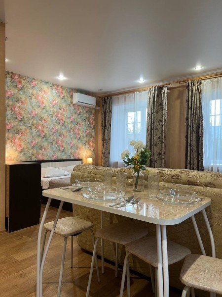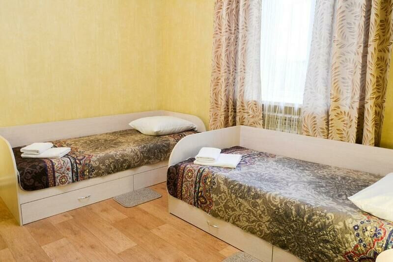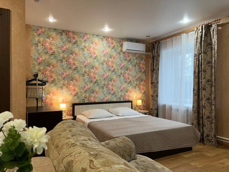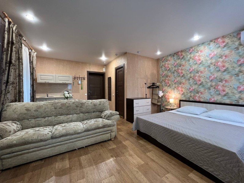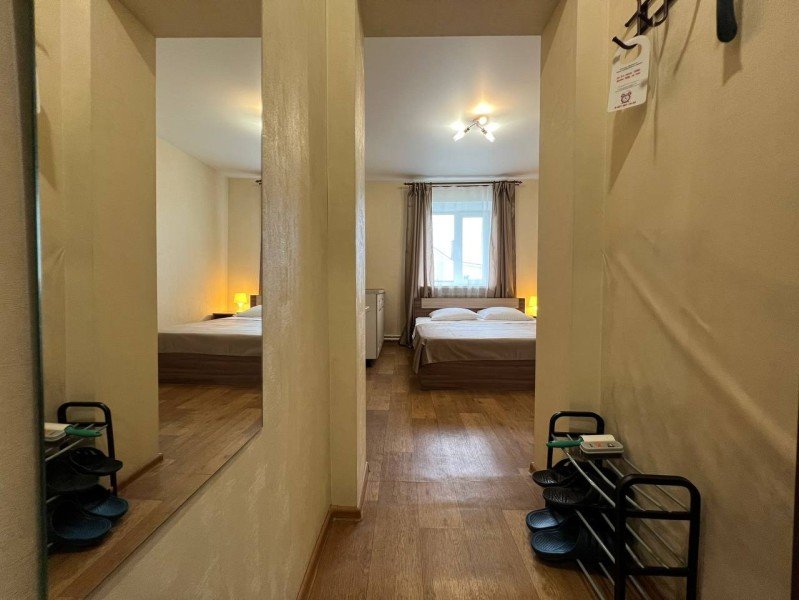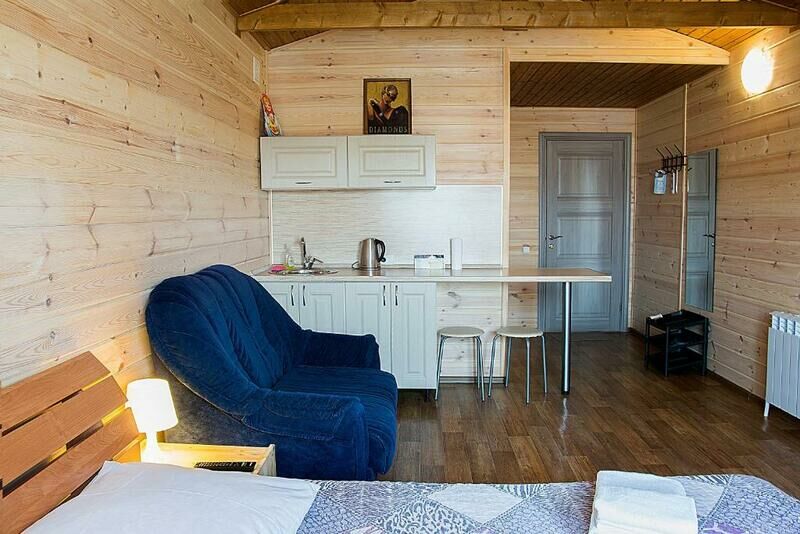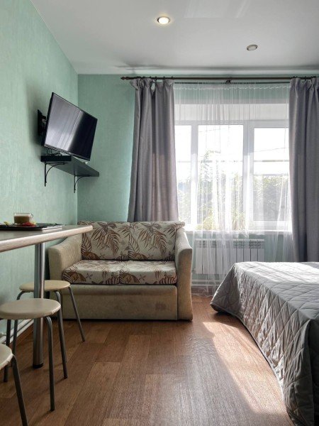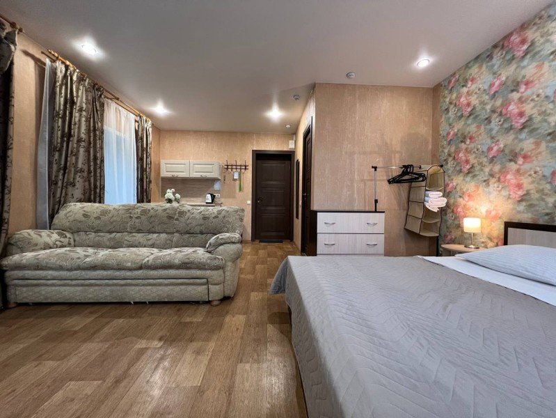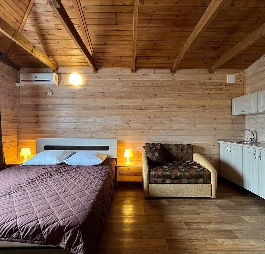 Семейный номер с двуспальной кроватью и двуспальным диваном. Номер комфорт, 22 м2, оснащен: мини-кухней: плита, чайник, стол со стульями, вся необходимая посуда. Приятный бонус в виде чая и конфет.