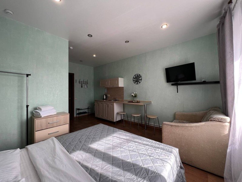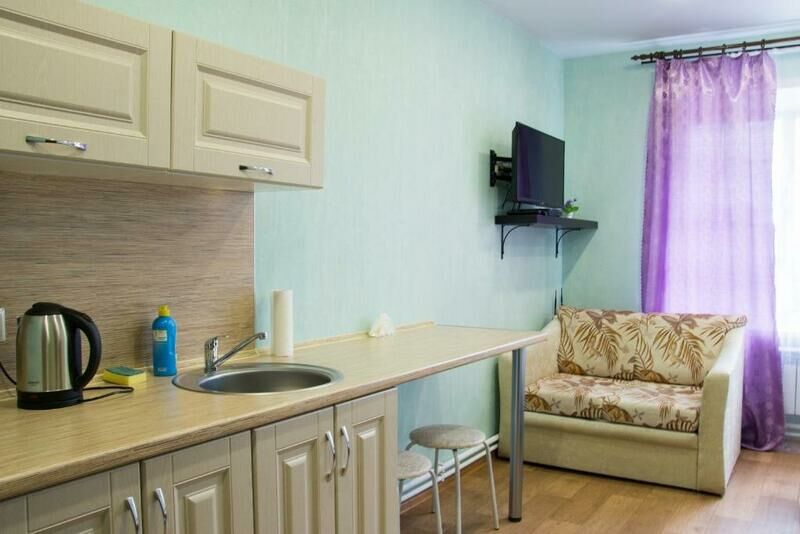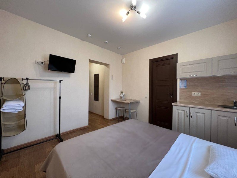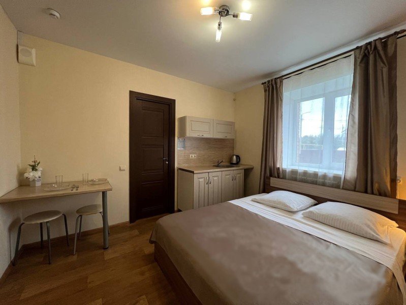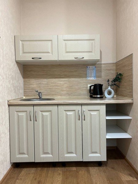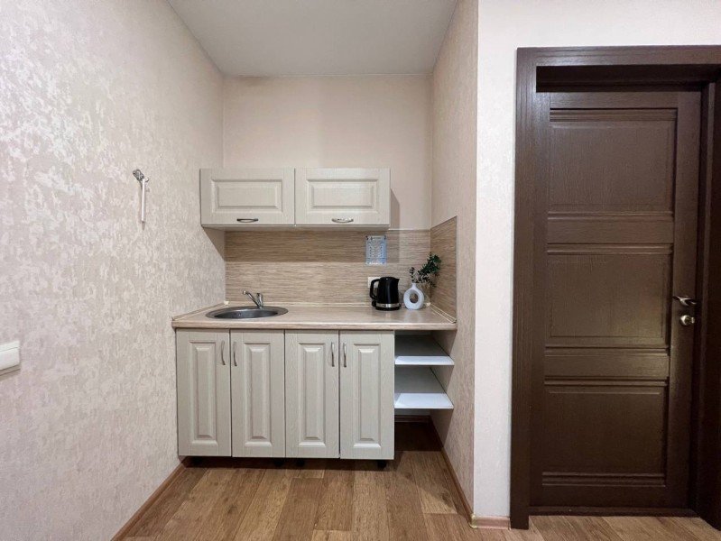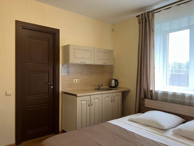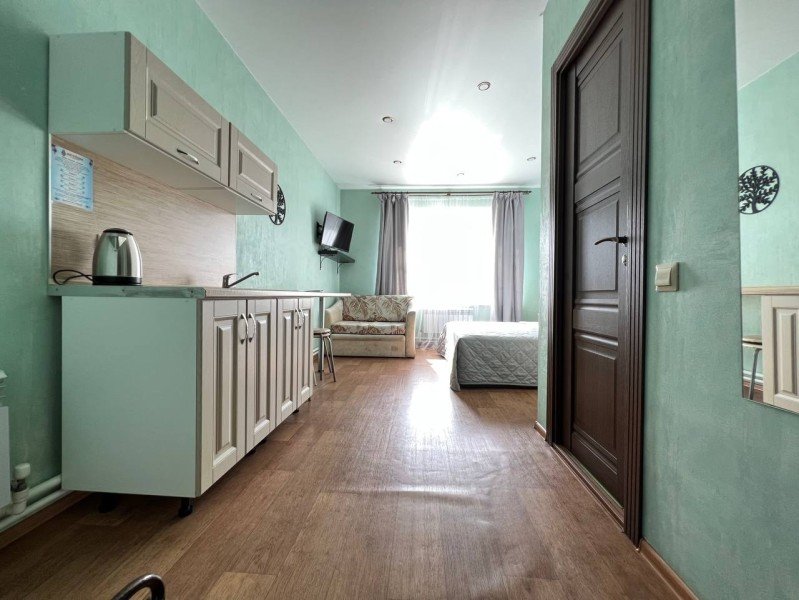 Улучшенный номер, 20 м2, оснащен: мини-кухней: плита, чайник, вся необходимая посуда. Приятный бонус в виде чая и конфет.