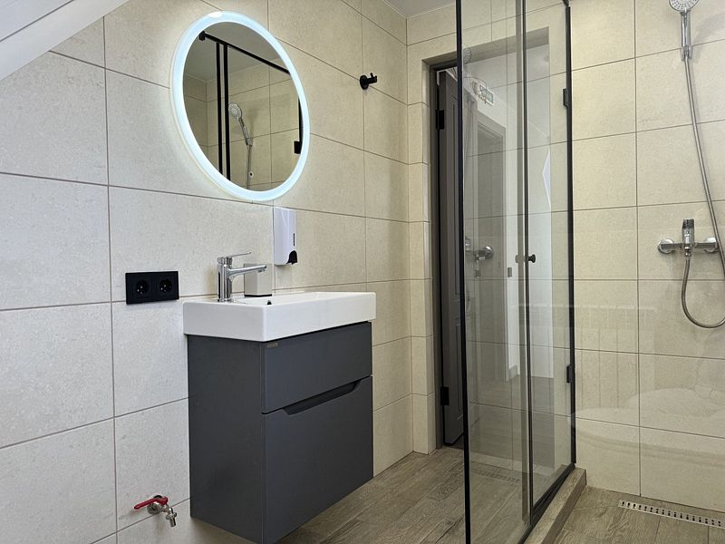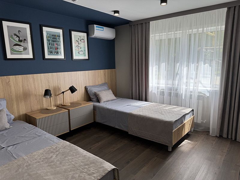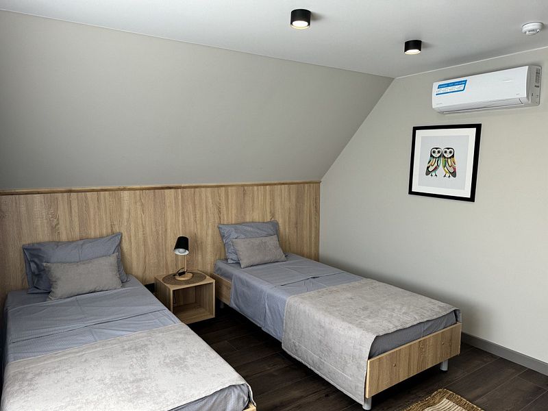 В доме: 5 спален с односпальными кроватями, оборудованные шкафами и прикроватными тумбочками. На каждом этаже собственный санузел с душем. В домике есть небольшая кухня. В домике предусмотрены: TV, чайник, холодильник, микроволновка, сервировочная посуда, уличный пластиковый стол. Сковороды и кастрюли не предоставляются.